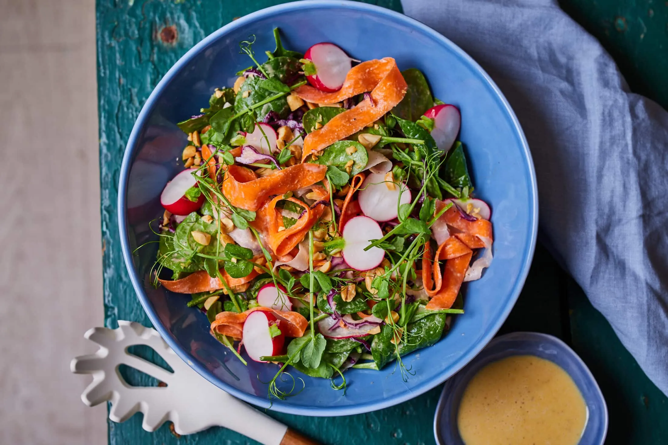 A hónapos retek felét vékonyan felszeleteljük, a másik felét negyedeljük. A jégcsapretket is felcsíkozzuk a hámozóval, a lila káposztát pedig vékony csíkokra vágjuk. Mindent összekeverünk egy tálban a spenótlevelekkel, majd meglocsoljuk a dresszinggel. Ehhez a hozzávalókat késes aprítóba tesszük és minél simább, homogénebb dresszinggé turmixoljuk.