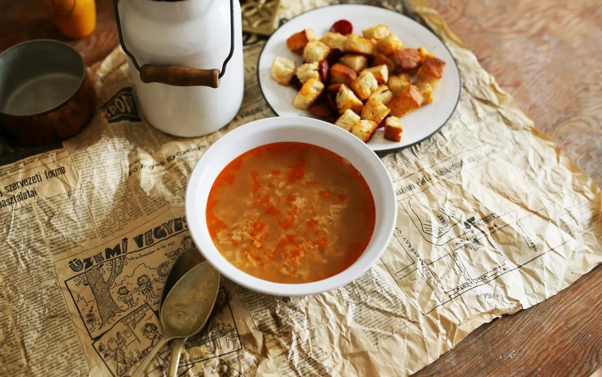 Az egész köményt és fekete borsot egy mozsárban összetörjük és egy száraz lábasban elkezdjük pirítani, hogy kiadja az intenzív ízét. Hozzáadjuk a zsírt, a lisztet, a zúzott fokhagymát és a pirospaprikát. Zsemleszínűre pirítjuk, majd hozzáöntjük a víz negyedét, csomómentesre keverjük a liszttel, aztán felöntjük a maradék vízzel. Ízesítjük babérlevéllel, dobunk bele egy kis fej vöröshagymát bevagdosva, sót, egy csipet cukrot és 15 percig alacsony lángon rotyogtatjuk. Adunk hozzá egy kevés ecetet, kóstolással beállítjuk a savanyú-édes-fűszeres ízeket. A tojásokat villával felverjük, a levesbe örvényt keverünk és vékony sugárban a közepébe csurgatjuk a tojást. Közben nem kevergetjük. Hagyjuk, hogy 1 perc alatt megfőjön a tojás, utána keverünk rajta egyet.A kolbászt vékony karikákra vágjuk, egy száraz serpenyőben jól lepirítjuk, majd félretesszük. A kisült zsírban megpirítjuk a felkockázott kenyeret, összeforgatjuk a ropogós kolbászkarikákkal és a leves mellé kínáljuk.