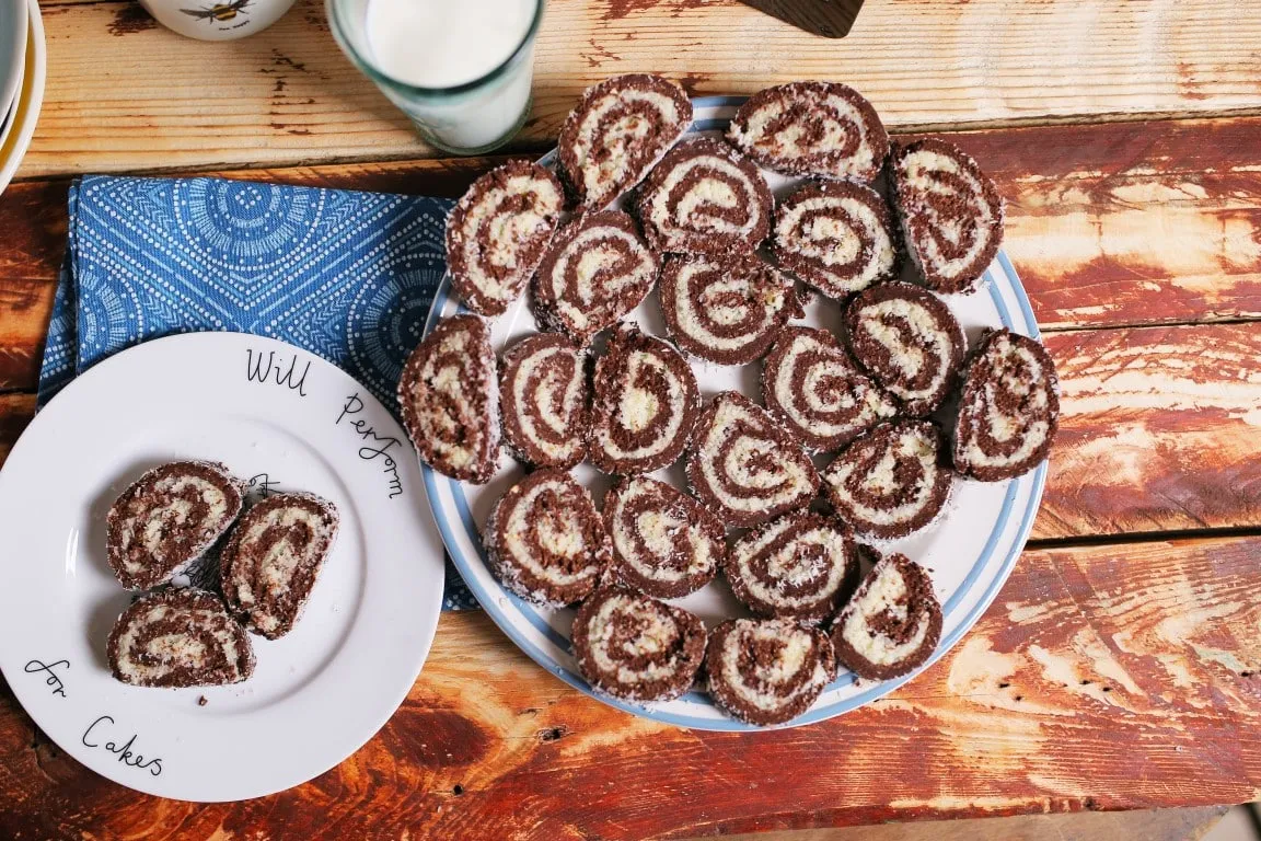 A darált kekszet összekeverjük a kakaóporral, a porcukorral, a tejjel és a rummal, és addig gyúrjuk, míg összeáll. Berakjuk a hűtőbe pár percre amíg megcsináljuk a krémet. A vajat és a porcukrot kikeverjük, majd hozzáadjuk a kókuszreszeléket. Egy deszkára kiterítünk egy nagyobb folpackot, megszórjuk kókuszreszelékkel, és kb. fél centi vastagra nyújtjuk a kekszes masszát. Rányomkodjuk a kókuszos vajas tölteléket, majd a fólia segítségével feltekerjük, közben jó szorosan lenyomkodjuk. A tekercset kívülről megforgatjuk kókuszreszelékben, majd ujjnyi vastag szeletekre vágjuk.