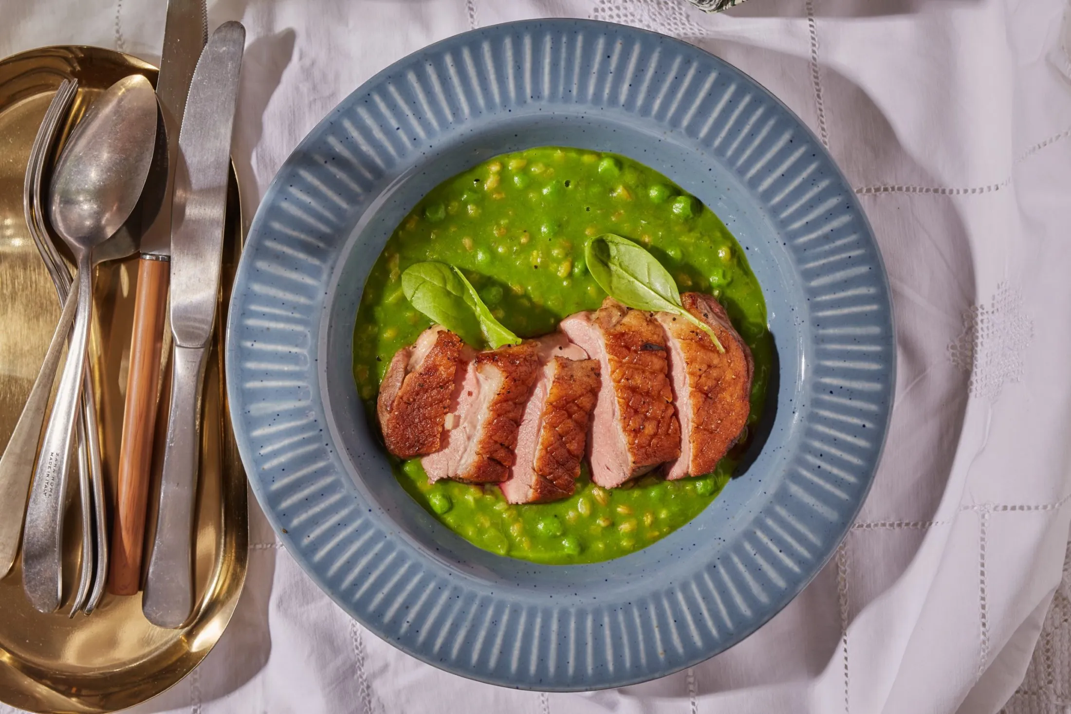 A borsóból 150 grammot 3-4 percig forralunk annyi alaplében, ami ellepi, majd egy aprítógépben, turmixgépben vagy botmixerrel krémesre zúzzuk a spenóttal együtt. A rizottót az 5-10 percig pihentetett kacsamellel fogyasztjuk.