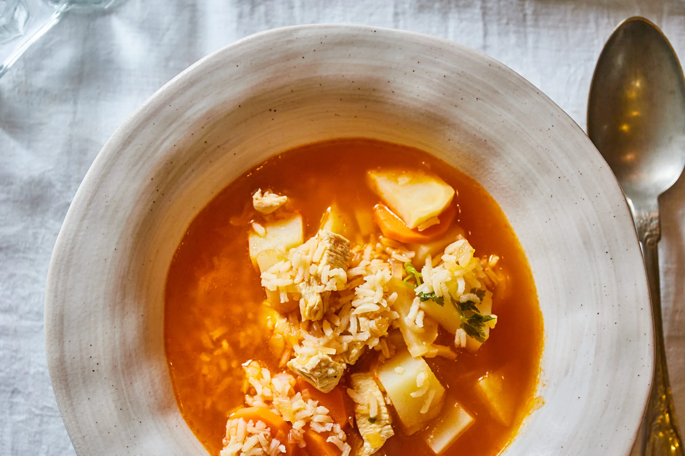A rizsleves elkészítéséhez zsírt melegítünk egy lábasban. Hozzáadjuk a finomra vágott vörös- és fokhagymát, és közepes hőfokon 5 percig dinszteljük. Hozzáadjuk a kb. 1 centis kockákra vágott csirkemellet, a 0,5 cm-es karikára vágott sárga- és fehérrépát, az 1 cm-es kockákra vágott krumplit, majd a rizst, és közepesen erős hőfokon 1 percig pirítjuk.