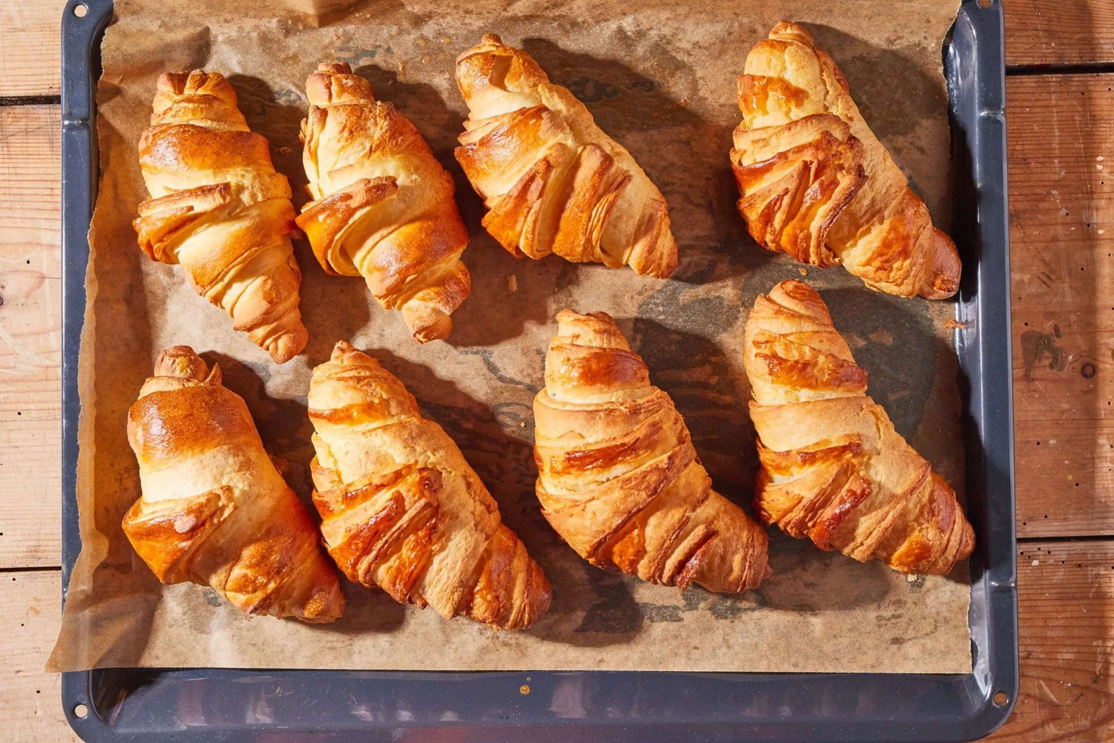A pihentetés után a tésztát kissé átgyúrjuk, majd nyolc részre osztjuk, gombóccá formázzuk, és kör alakúra nyújtjuk. A vajat 7 részre osztjuk, majd a tésztakorongokat egymásra rétegezzük úgy, hogy mindegyik réteg közé kenünk 1-1 adag vajat. Az egymásra rétegezett tésztát olyan vékonyra nyújtjuk, amennyire tudjuk, majd átlósan 12 részre vágjuk.