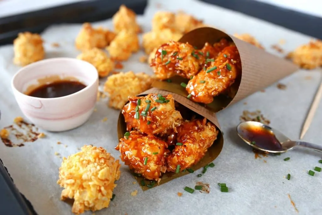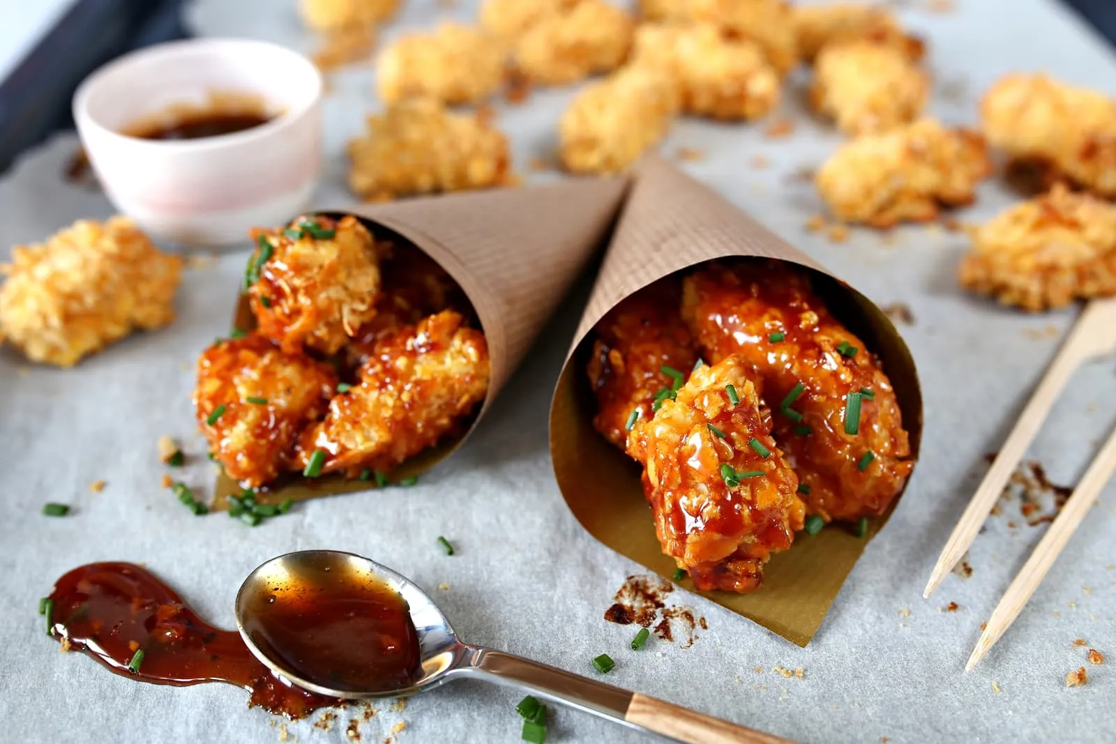 A ropogós csirkefalatok elkészítéséhez kb. hüvelykujjnyi darabokra vágjuk a csirkemellet, picit sózzuk, borsozzuk. Egy kis tálba mérjük a lisztet. Egy másikban a tojást lazán felverjük és összekeverjük a tejjel. Egy harmadik tálban durvára törjük a corn flakes-t. A csirkedarabokat először a lisztbe forgatjuk, aztán a tejes tojásba, végül a durvára tört kukoricapehelybe. Sütűpapíros tepsire rakosgatjuk az így bepanírozott csirkedarabokat és 200 C-on kb 18 perc alatt aranybarnára sütjük. Amíg a csirke sül egy kis edénybe öntjük a szósz hozzávalóit és összeforraljuk. Folyamatosan kevergetve szirupos állagúra sűrítjük. Amikor a csirkemellek megsültek, belefogatjuk őket az elkészült szószba.