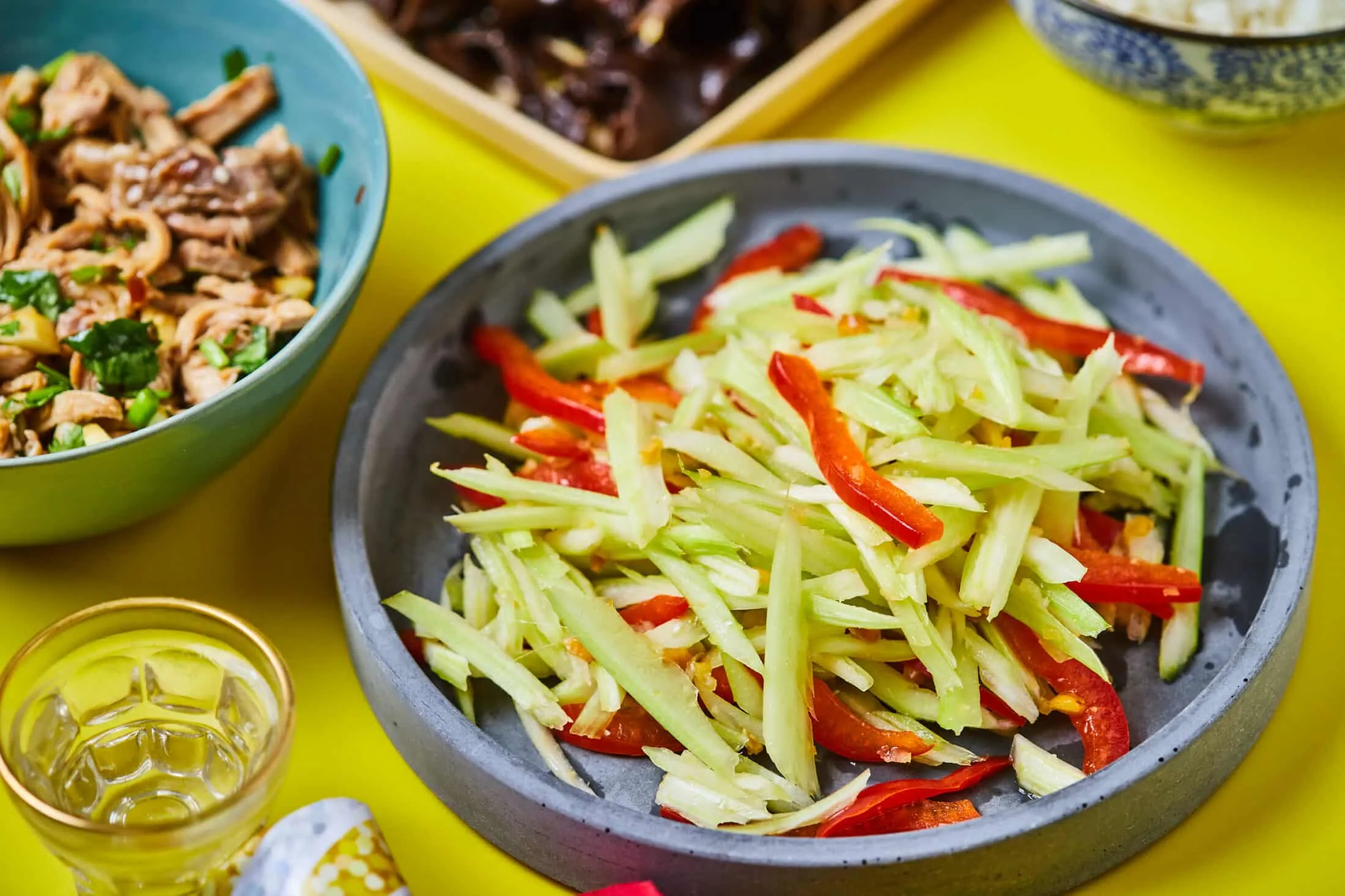 Időközben a kaliforniai paprikát is vékony csíkokra vágjuk, és a zellerhez adjuk. Egy keverőtálban összekeverjük a sót, a cukrot és az olívaolajat. Egy fokhagymanyomóval belenyomjuk a szószba a fokhagymát is. A földimogyorót egy frissen tartó tasakba tesszük, és egy sodrófával felaprítjuk.