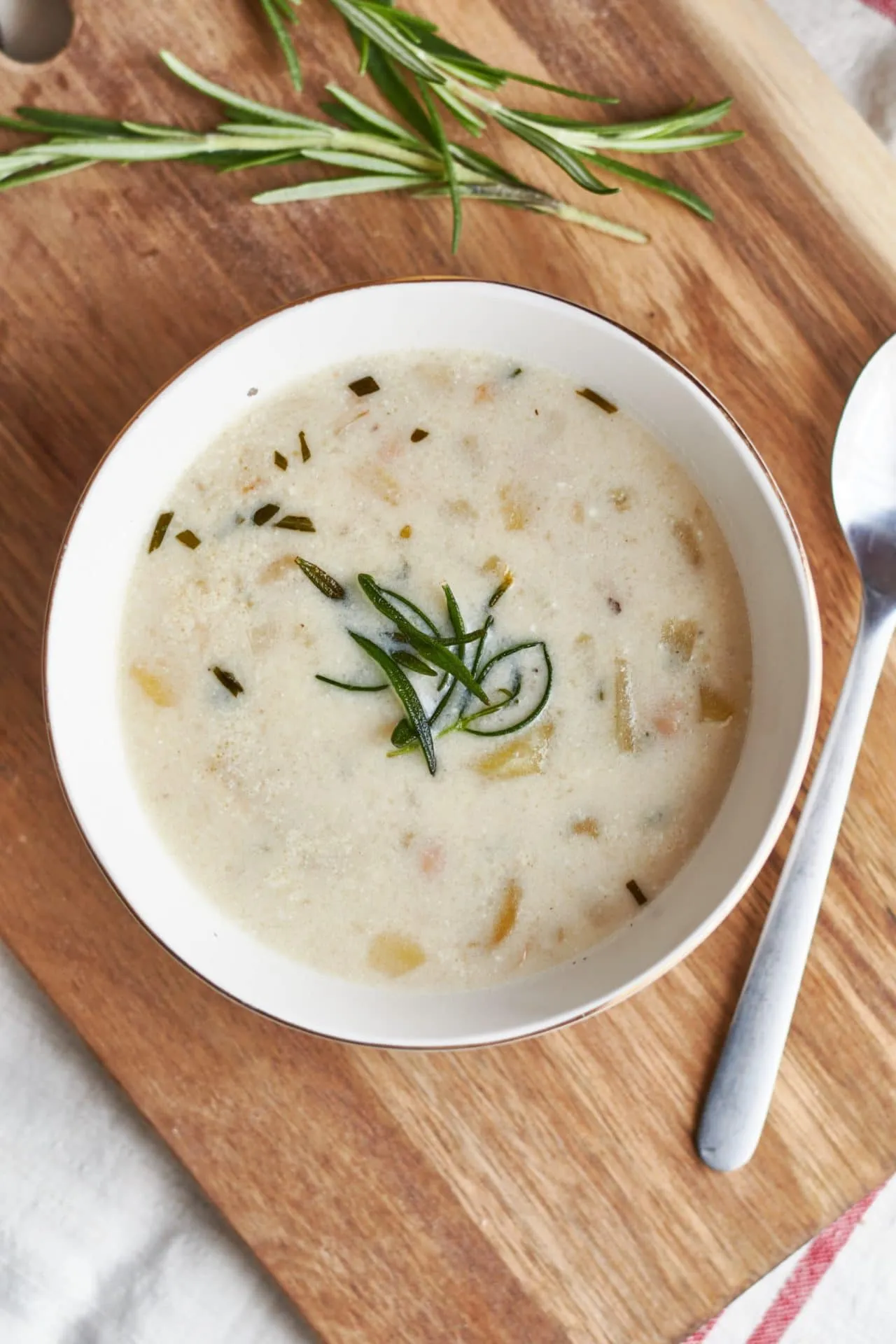 A hagymát és a fokhagymát apróra vágjuk, a burgonyákat pedig meghámozzuk, hosszában félbevágjuk, aztán szeletekre. Az olajat egy lábasban felhevítjük, és üvegesre pirítjuk a hagymákat, utána mehetnek hozzá a durvára vágott rozmaringlevelek, a burgonyaszeletek, majd a víz (vagy alaplé). Sózzuk, borsozzuk, és puhára főzzük a burgonyát. A keményítőt elkeverjük a tejföllel, pár evőkanál forró levest adunk hozzá, átkeverjük, és így öntjük vissza a levesbe. Mehet bele a lecsepegtetett babkonzerv is, majd egy alapos keverés után megvárjuk, amíg rottyan egyet a leves, és le is húzzuk a lángról.