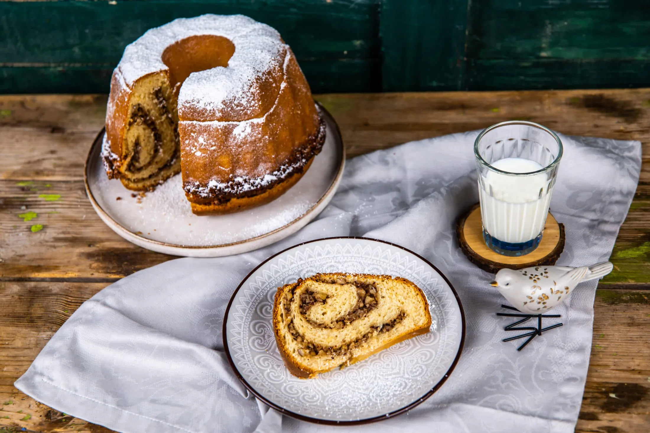 A töltelékhez felverjük a fehérjéket, majd belekeverjük a többi hozzávalót. Megkenjük vele a kinyújtott tésztát, a hosszabbik oldala mentén feltekerjük, és belerakjuk a kuglófformába. 40-50 percig kelesztjük, amíg szépen megkel, majd berakjuk a 175 fokra előmelegített sütőbe kb. 35-40 percre. Mikor langyosra hűlt, kiborítjuk a kuglófformából, megszórjuk porcukorral, és szeletekre vágva tálaljuk.