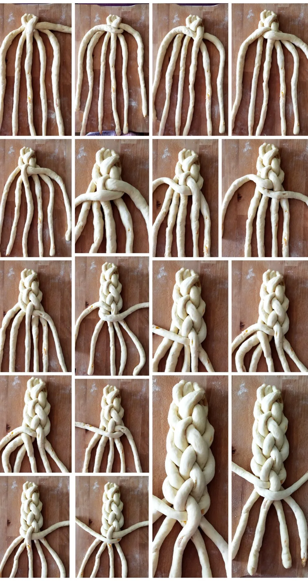 A 6 rúd végét összecsípjük, majd először a jobb szélsőt áthajtjuk a bal oldalra, a bal szélsőt pedig a jobb oldalra. Amit az imént jobb oldalra hajtottunk, berakjuk középre, majd jöhet jobb szélről a második, ami átkerül bal oldalra. A bal oldali második rúd átkerül a jobb oldalra, a bal oldali szélső pedig középre, majd jön a jobb oldali második bal oldalra, a jobb oldali szélső pedig középre, és így haladunk oldalanként két rúd hajtogatással, amíg el nem fogy a tészta. Ugyanezt megismételjük a másik 6 rúddal is.