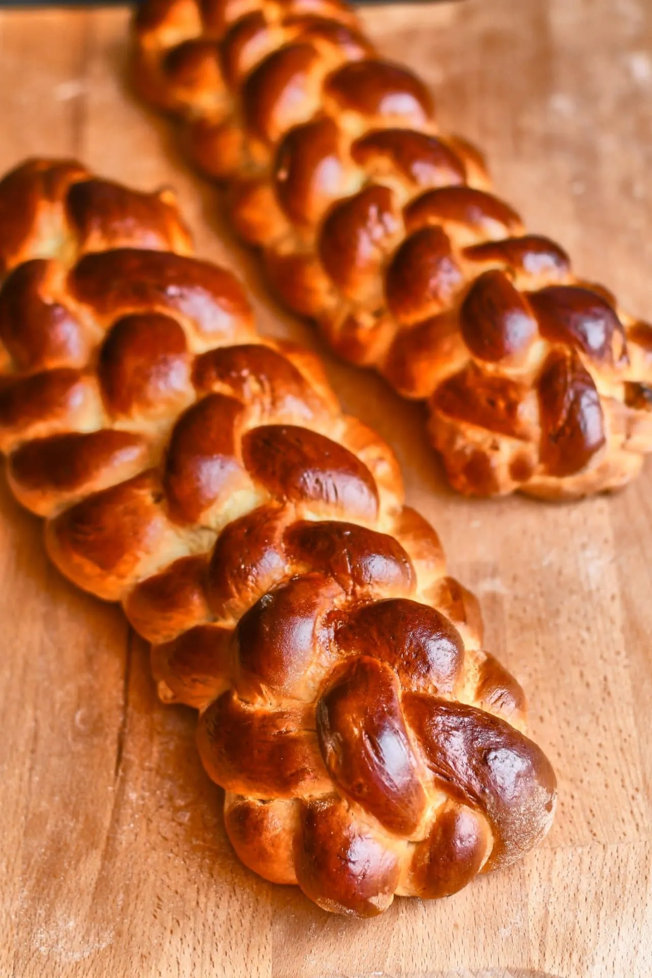 Mindkét fonat végeit a fonat alá hajtjuk, és sütőpapírral bélelt tepsin 35-40 percig kelesztjük. Lekenjük őket a tejjel össszekevert tojással, és mehetnek is a 175 fokra előmelegített sütőbe, amíg szép aranybarnák lesznek. Hagyjuk őket legalább langyosra hűlni, mielőtt felvágnánk.