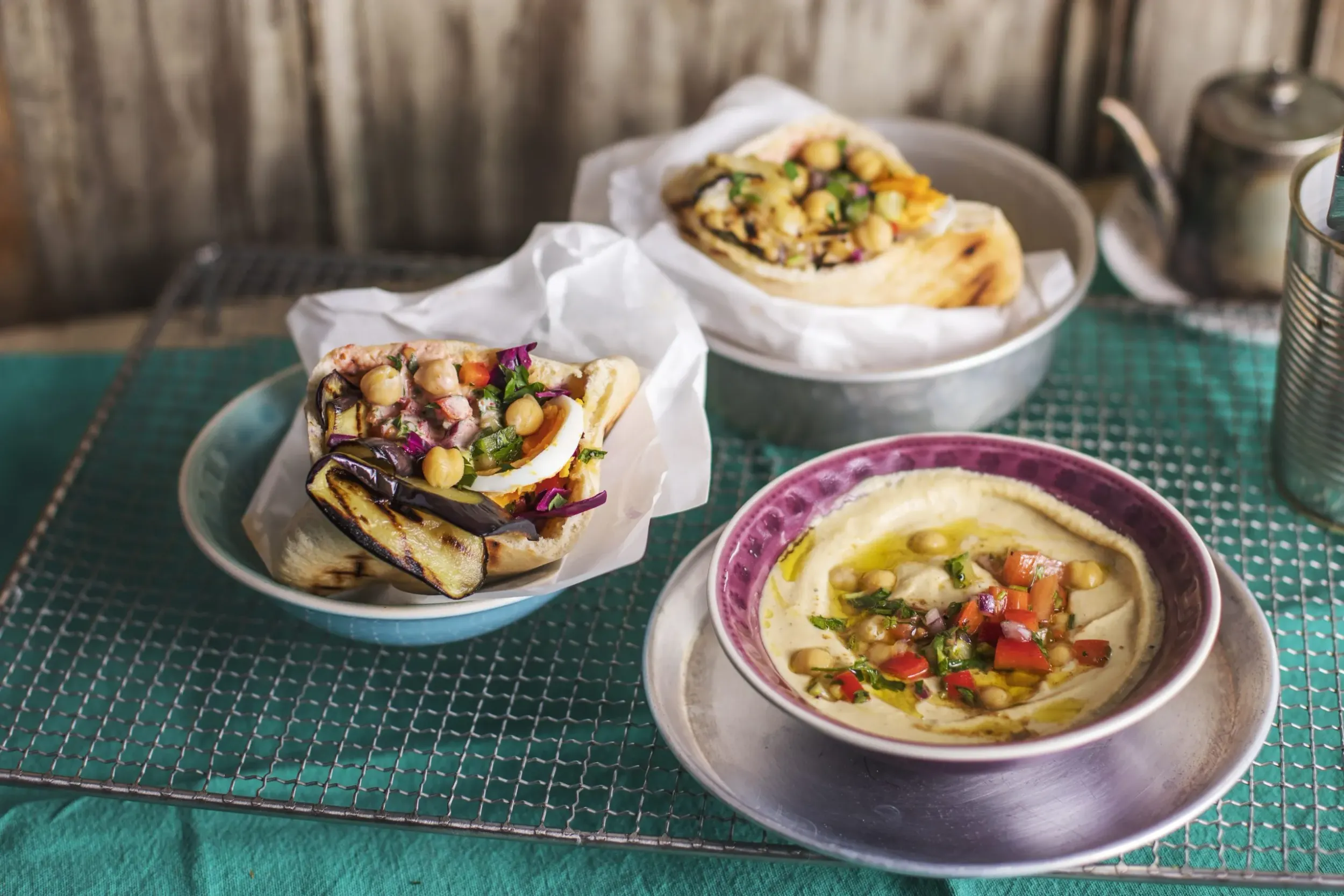 A hummusz hozzávalóit egy aprítógépbe rakjuk és krémesre pürésítjük. Az arab salátához apró kockákra vágjuk a paprikát, paradicsomot, uborkát, lilahagymát és egy keverőtálban összekeverjük az olívaolajjal, citromlével, felaprított petrezselyemmel, sóval borssal. A padlizsánt kb. fél cm vastagra vágjuk, megsózzuk, meglocsoljuk egy kevés olívaolajjal és lepirítjuk mindkét felét egy grillserpenyőben, majd kiszedjük. A káposztát vékonyan felszeleteljük, sózzuk, borsozzuk, meglocsoljuk az almaecettel és nyakon öntjük forró vízzel. Addig hagyjuk benne állni, amíg ki nem hűl., majd leszűrjük.