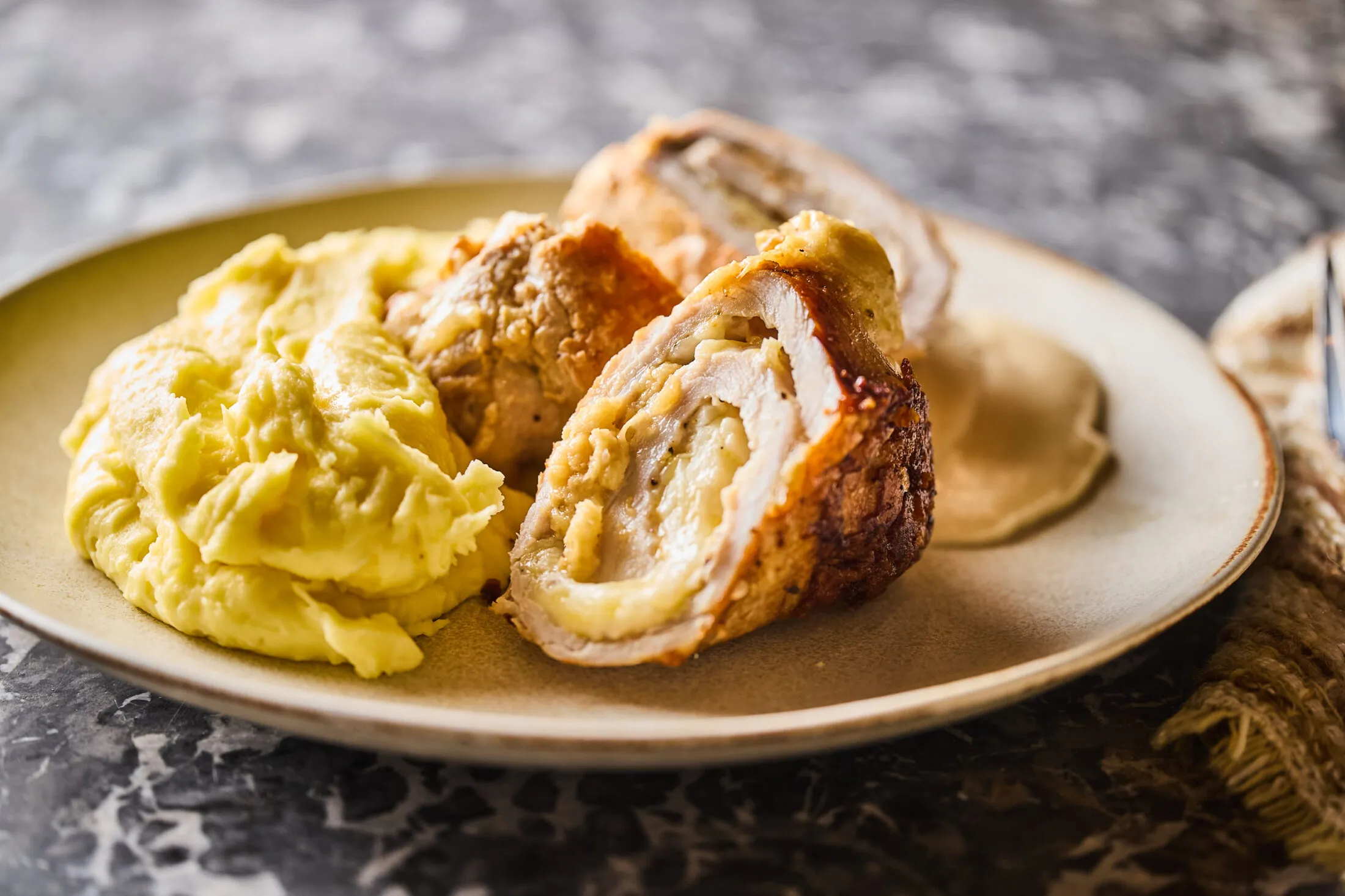 Karácsonyi porchetta karottapürével, sült burgonyával és barnamártással