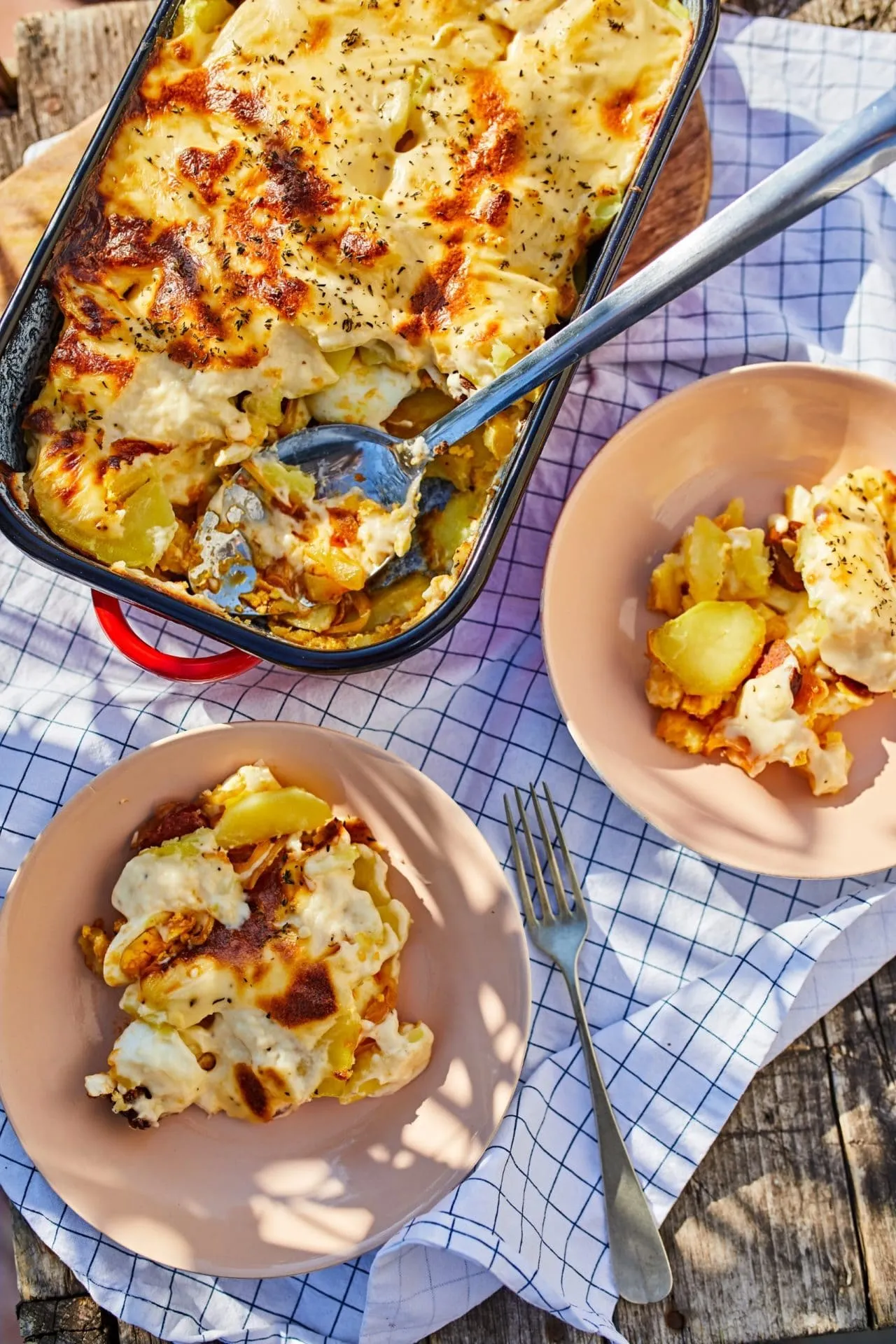 Egy kb. 40 x 25 cm-es tepsiben eloszlatjuk a felszeletelt főtt burgonya felét, jöhet rá a kolbászos-hagymás mix, a felszeletelt főtt tojás, majd a tetejére a burgonya másik fele. Leöntjük a sajtmártással, megszórjuk az aprított kakukkfűvel, és 200 fokra előmelegített sütőben kb. 20-30 perc alatt aranybarnára sütjük.