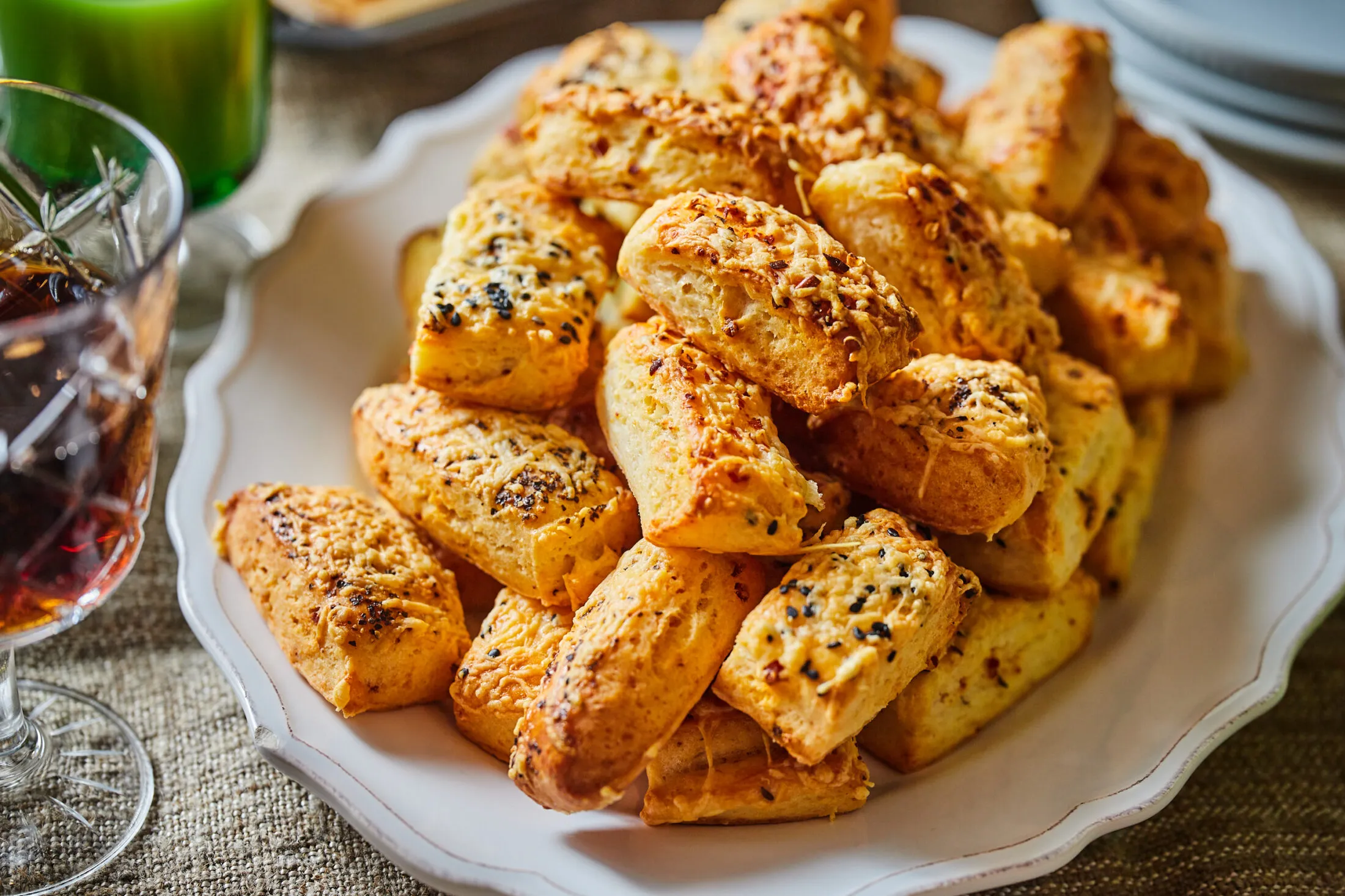 A tésztát lisztezett deszkán kb. 1 cm vastagságúra nyújtjuk, és késsel megjelölve négy részre osztjuk. Felvert tojással vékonyan megkenjük, majd ízlés szerint meghintjük fűszerekkel és magokkal. Megszórjuk reszelt sajttal, amit a szeletelés előtt lenyomkodunk, majd a jelölések mentén előbb négybe, aztán falatokra vágjuk a tésztát. Sütőpapírral bélelt tepsiben, 230 fokra előmelegített sütőben 8-10 perc alatt készre sütjük.