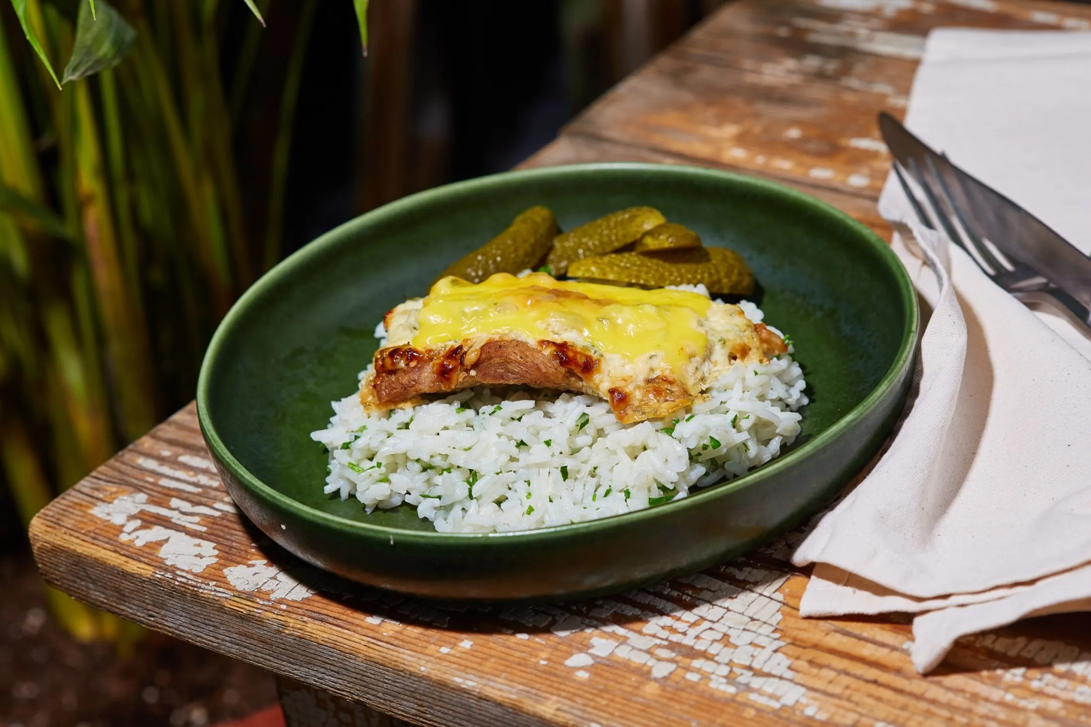 A tejfölbe belekeverjük a keményítőt, a reszelt sajtot, belenyomunk 1 gerezd fokhagymát, hozzáadunk egy kis csokor felaprított petrezselymet, és megsózzuk. Bekenjük vele a húsok tetejét, majd minden szeletet befedünk lapka sajttal, és 180 fokra előmelegített sütőben kb. 8 perc alatt ráolvasztjuk. Bármilyen körettel megállja a helyét, de mi a petrezselymes rizsre szavaztunk.