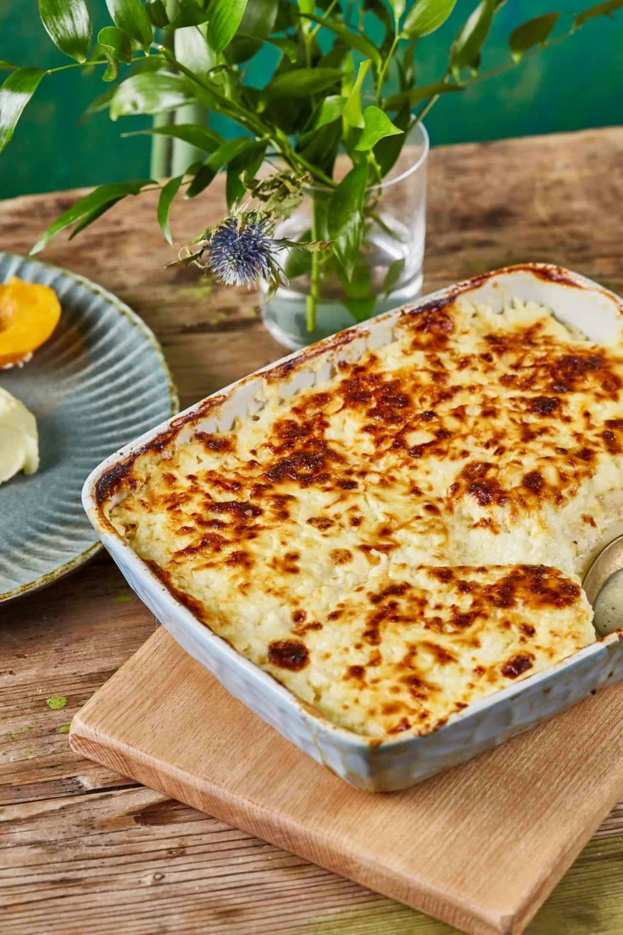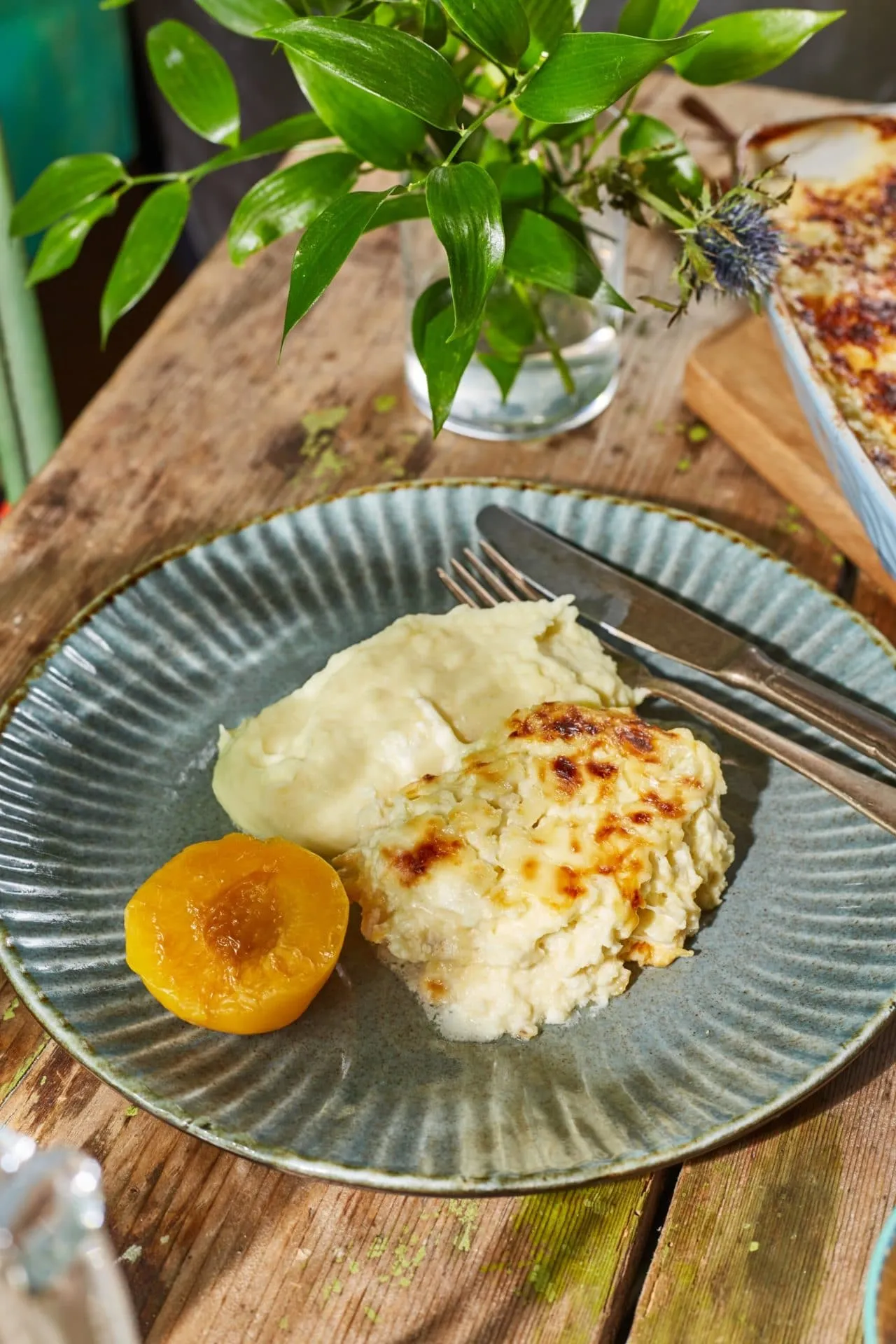 Miközben sül a hús, a burgonyát sós vízben feltesszük főni. A kakukkfüvet összemelegítjük 400 ml tejszínnel, majd félrehúzzuk a tűzről, így hagyva kioldódni a kakukkfű ízét. Ha megfőtt a burgonya, átpasszírozzuk egy burgonyanyomón, és folyamatos keverés mellett fokozatosan rászűrjük a tejszínt, ízlés szerint sózzuk. Barackbefőttel tálaljuk.