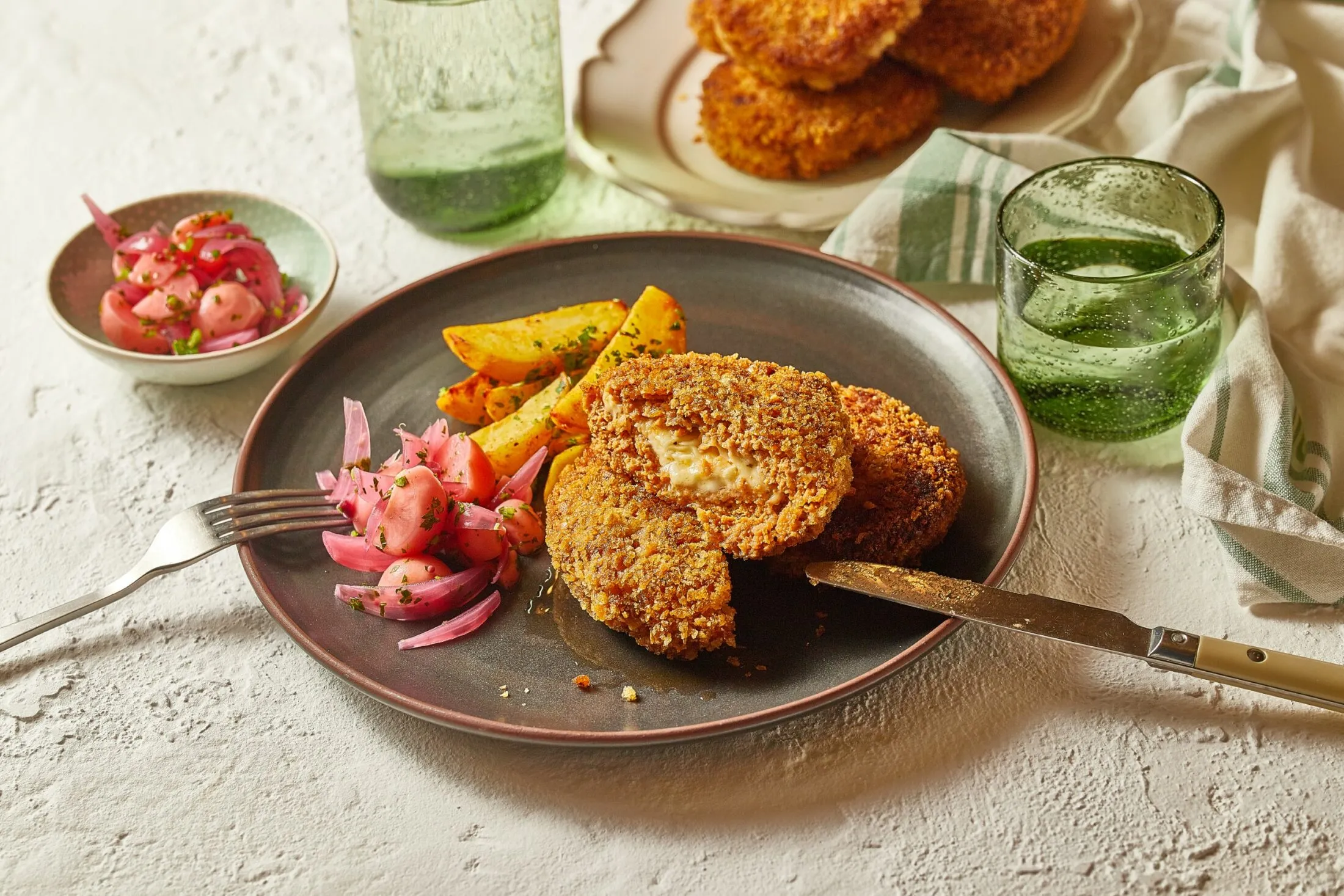 A sajtot felvágjuk 8 egyenlő darabra, mindegyik gombóc közepébe nyomunk egy kockát, majd zsemlemorzsába forgatjuk és pogácsa alakúra formázzuk őket. Egy mélyebb serpenyőben 160 fokosra melegítjük az olajat, és 6-8 perc alatt kisütjük benne a pogácsákat. Főtt-sült burgonyával és a kedvenc savanyúságunkkal tálaljuk a frissen sült fasírtokat.