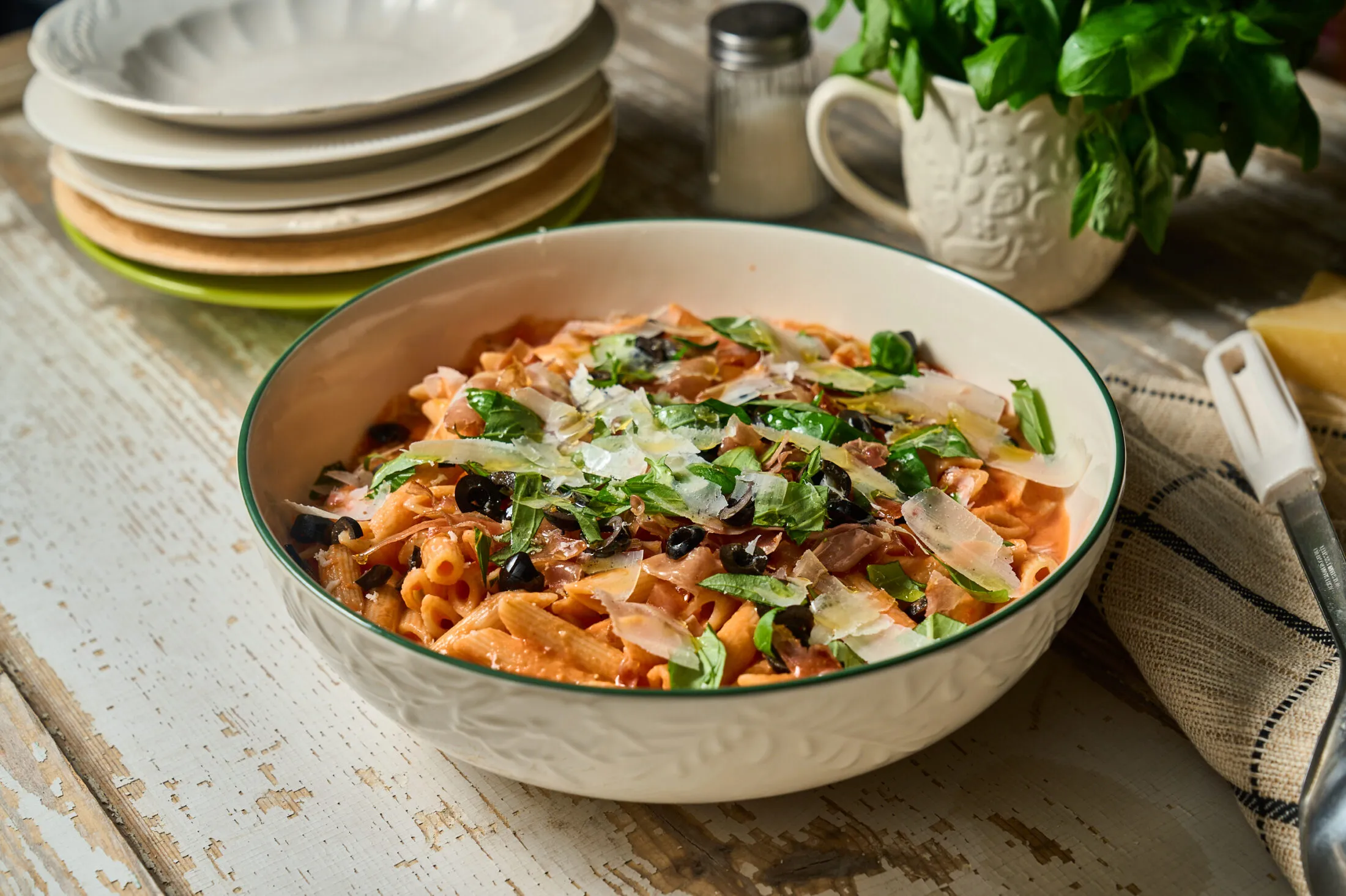 A sonkát egy serpenyőben, kevés olívaolajon ropogósra pirítjuk, majd felaprítjuk és a tésztasali tetejére szórjuk. Végül megszórjuk felkarikázott olívabogyóval, aprított bazsalikommal és a tetejére zöldséghámozóval parmezánt forgácsolunk.