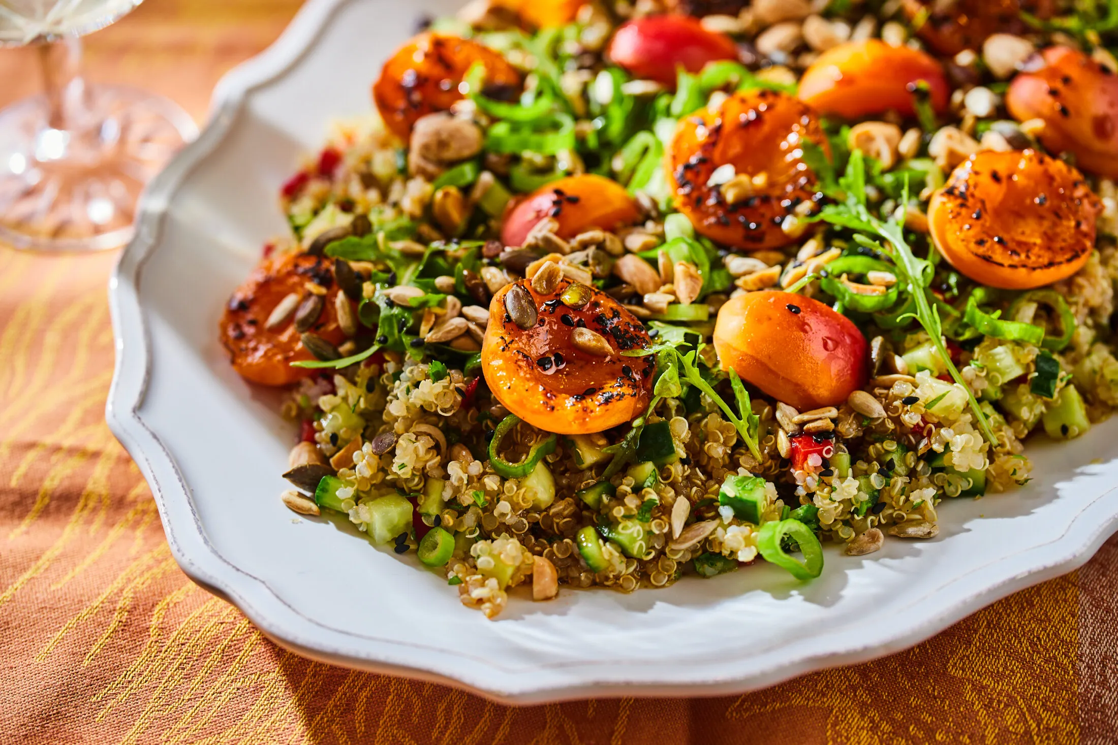Egy keverőtálban a rukkolát, a quinoát és a felvágott zöldségeket összekeverjük, és ízlésesen tálra terítjük. Meghintjük a pirított magvakkal, a tetejére pakoljuk a grillezett barackokat, és meglocsoljuk az öntettel. Buon appetito!
