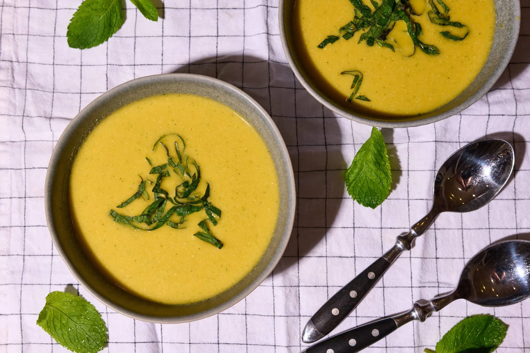 Ha nem lett annyira krémes a végeredmény a kesudió miatt, akkor egy szűrőn átpasszírozzuk, és máris élvezhetjük a nyár egyik legjobb nyers gyümölcslevesét, friss bazsalikommal és mentával tálalva.