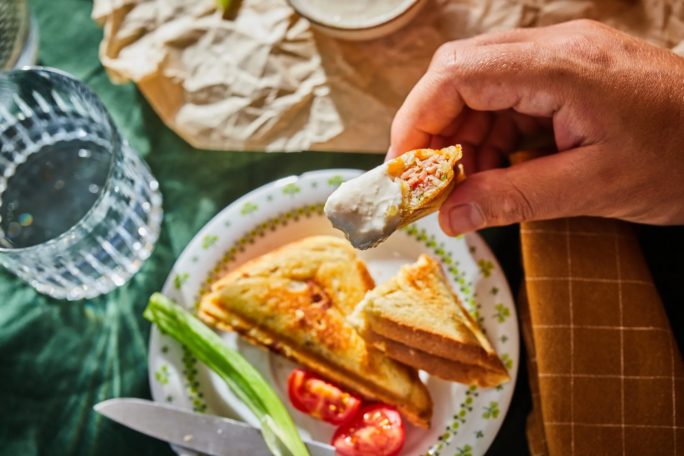 Amíg sülnek a melegszendók, egy kisebb tálban elkeverjük a majonézt és a tormát. Tányérra pakoljuk a háromszögre vágott szendókat, mellé jöhet a paradicsom és az újhagyma, és már indulhat is a tunkolás a majonézes tormába.