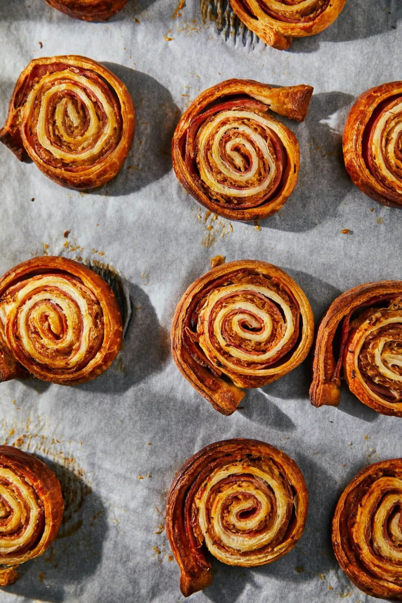 A tésztát enyhén lisztezett felületen kissé kinyújtjuk, betakarjuk a gépsonkával, rászórjuk a káposztát, majd a rövidebb oldalánál elkezdjük feltekerni. Egy éles késsel 2 centi vastag szeleteket vágunk belőle, és egy sütőpapírral bélelt tepsire tesszük.