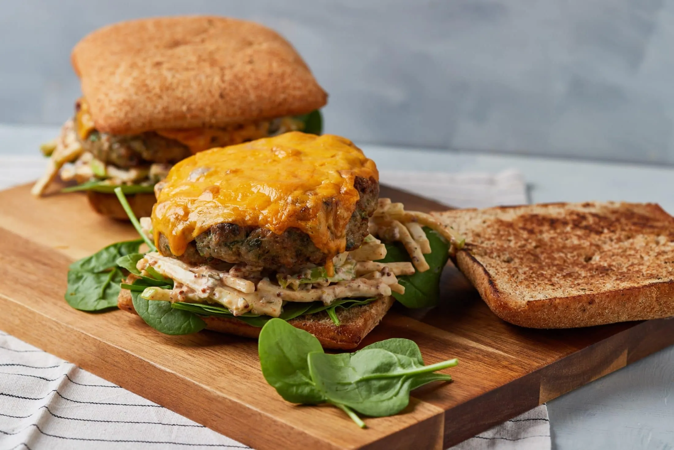 Egy füstölgő serpenyőben az olajon a húsok mindkét oldalát pirosra sütjük, majd egy sütőpapírral bélelt tepsire tesszük őket, rárakjuk a sajtot, és 180 fokra előmelegített sütőben 10-15 perc alatt készre sütjük. A ciabattába teszünk a bébispenótból, a Waldorf-betétből, ráhelyezzük a húst, majd a kenyér tetejét, és kész is.