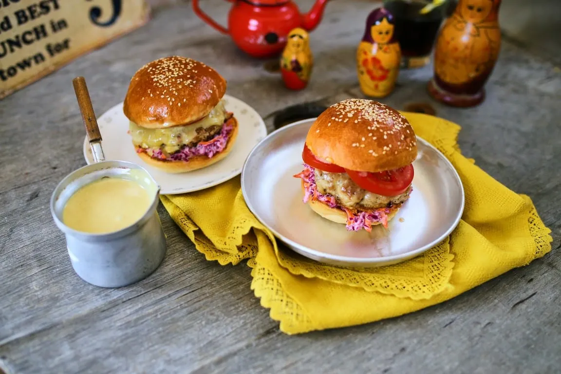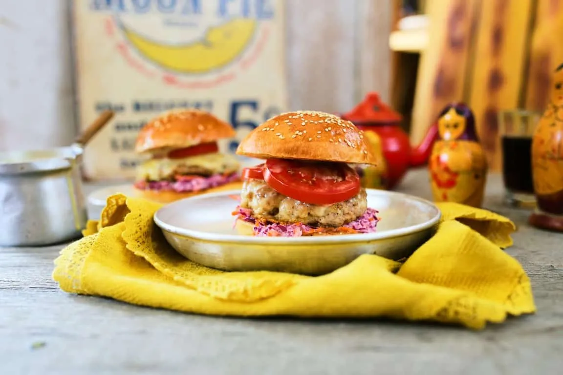 A darált sertéshúst három felé osztjuk és pogácsa alakúra formázzuk. Egy forró serpenyőbe tesszük, sózzuk, borsozzuk és alaposan megsütjük. Az egyik kész oldalára rakunk egy szelet sajtot és összeállítjuk a burgereket. A zsömléket ketté vágjuk, legalulra kerül a szószból egy nagy kanálnyi, utána jöhet a káposztasaláta, a sajtos hús, pár szelet friss paradicsom és a zsömle szintén szósszal megkent teteje.[/caption]