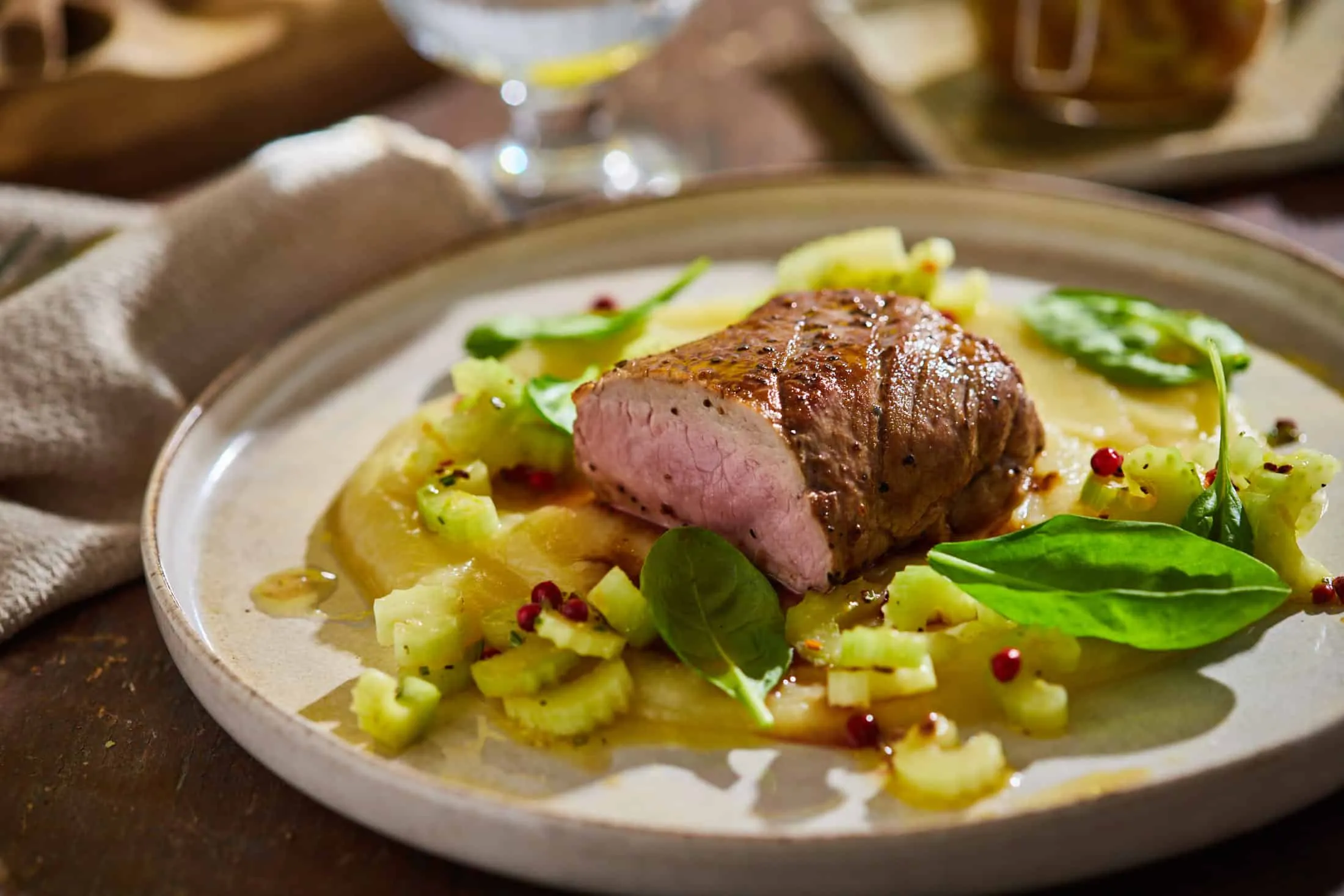 Sertésszűz burgonyás zellerpürével és marinált szárzellerrel