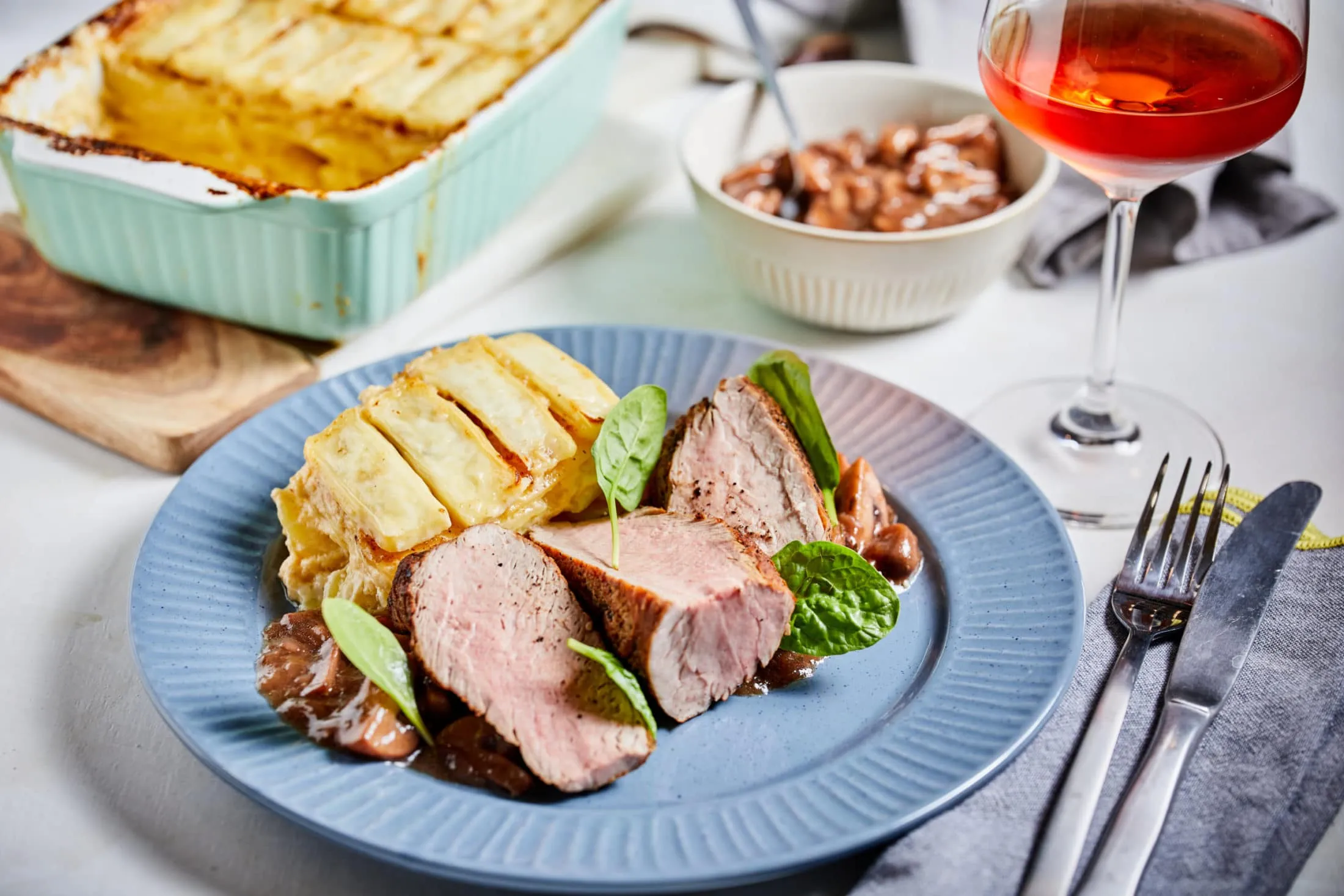 Felszeleteljük a gratin burgonyát, és tányérra szedünk belőle egy adagot. Mellétesszük a felszeletelt húst, és kanalazunk mellé a mártásból is. Spenótlevelekkel díszítjük.