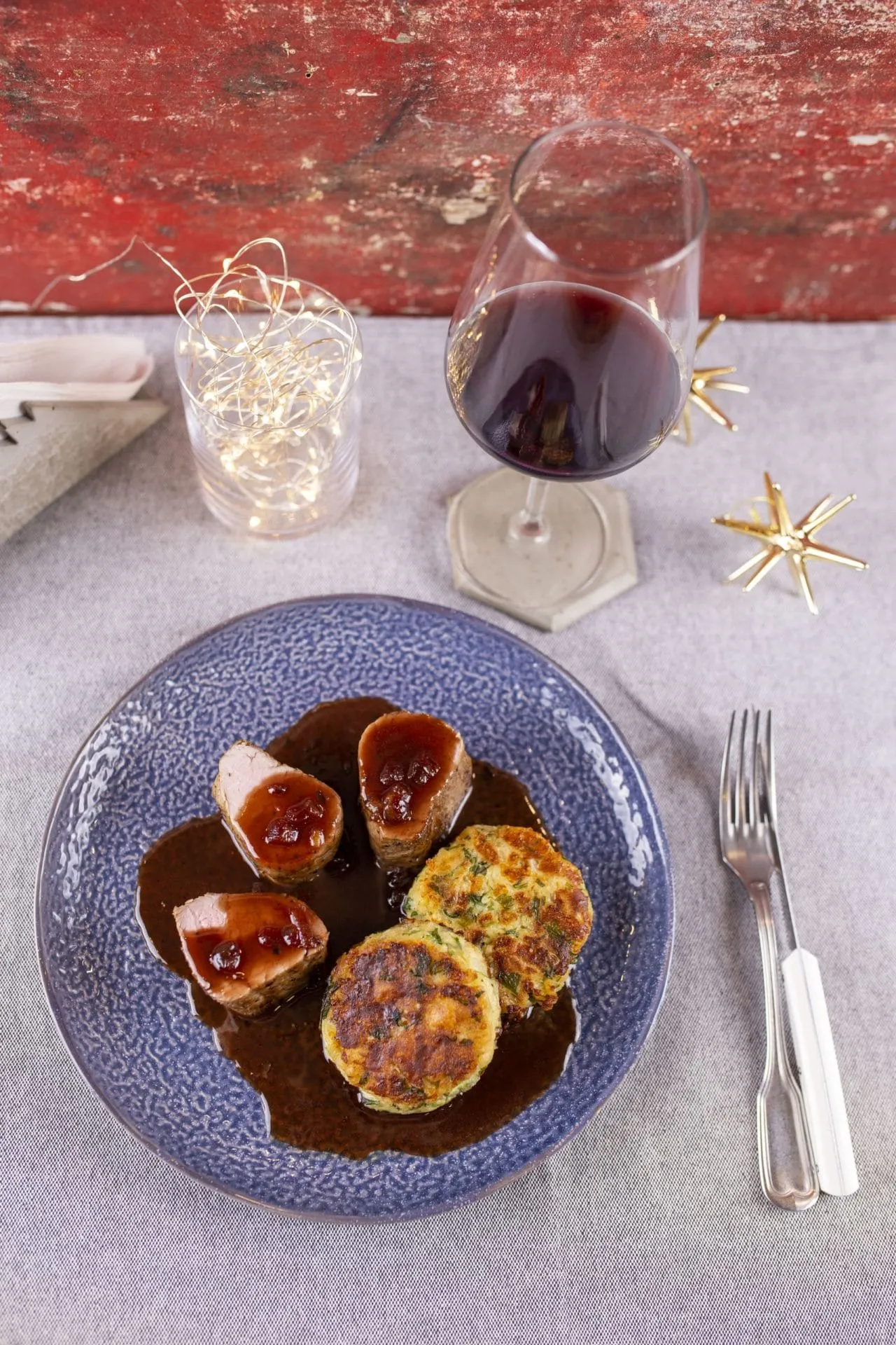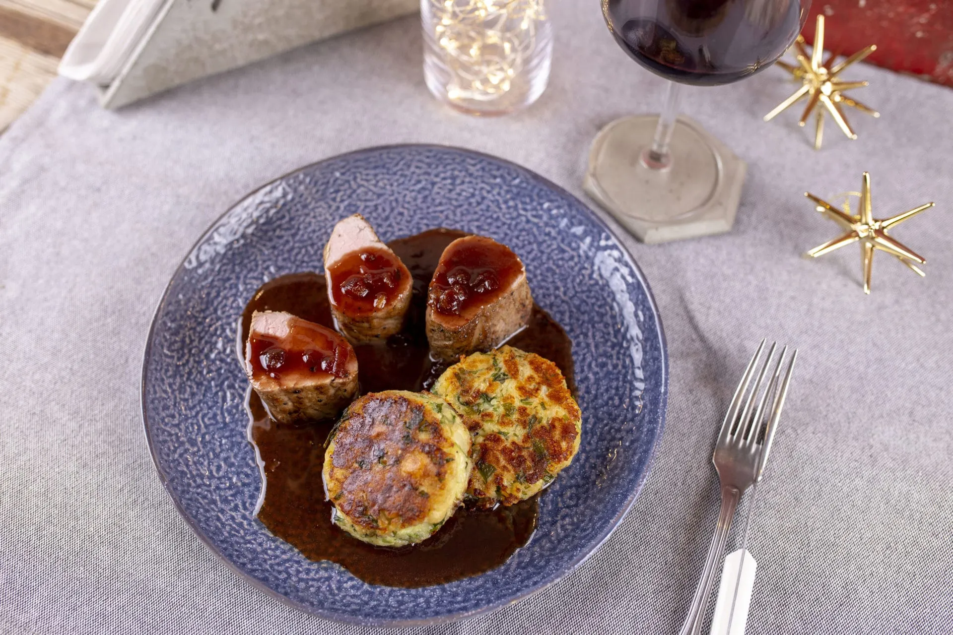 A knödelből pogácsákat formázunk, egy kevés olajon megpirítjuk őket, és a felszeletelt húst ezzel és a mártással tálaljuk.