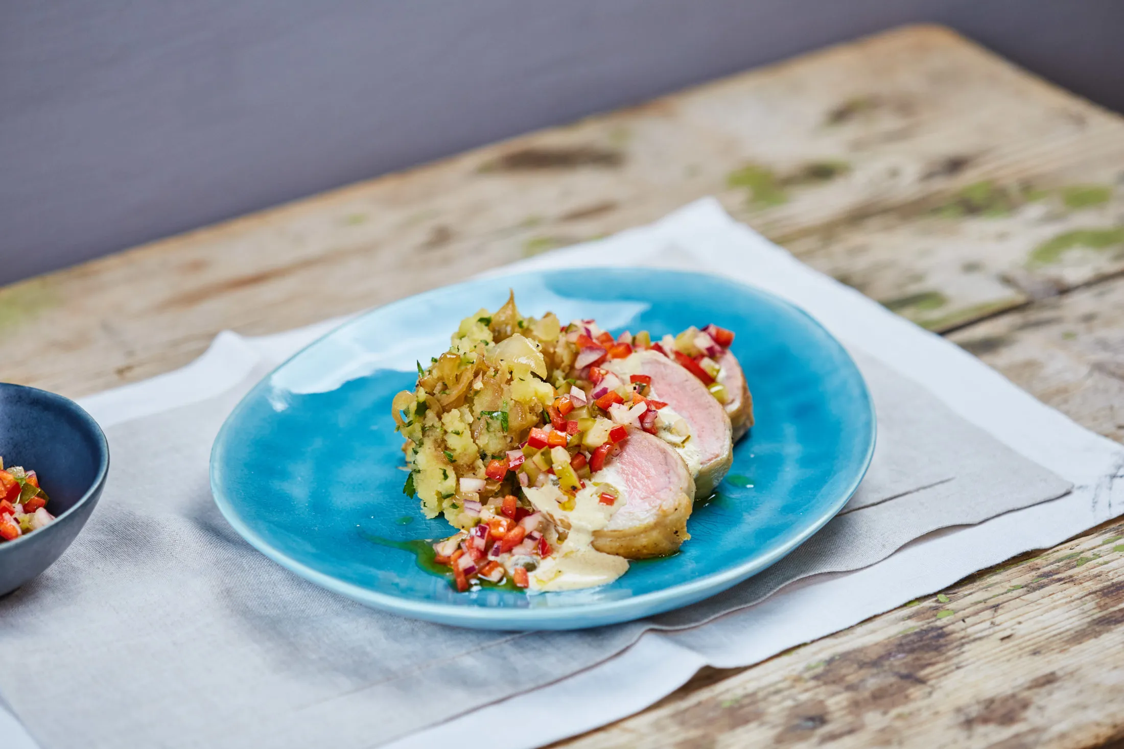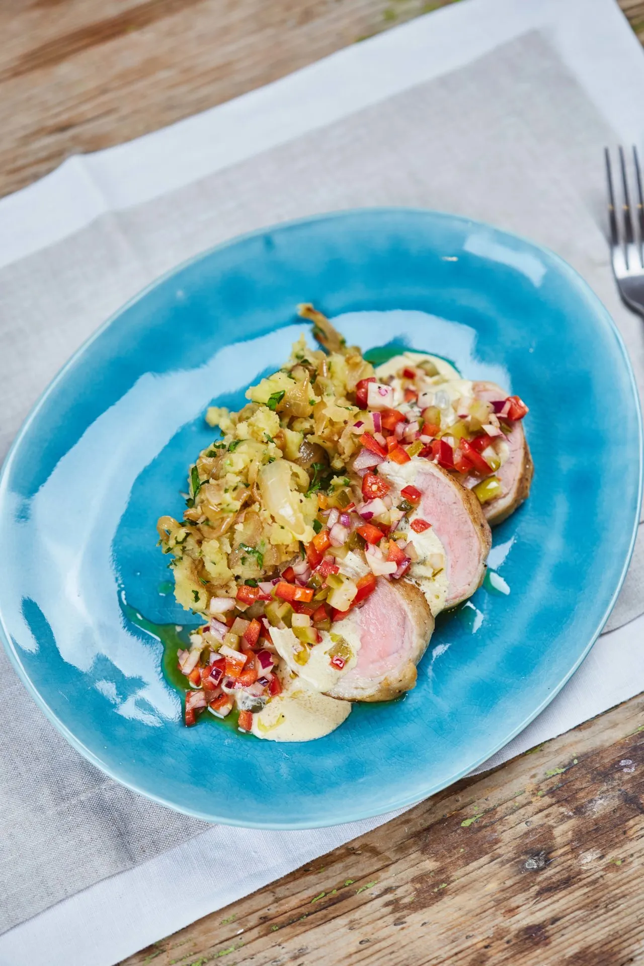 A felszeletelt húst a krumplipürével, a mártással és a salátával tálaljuk.