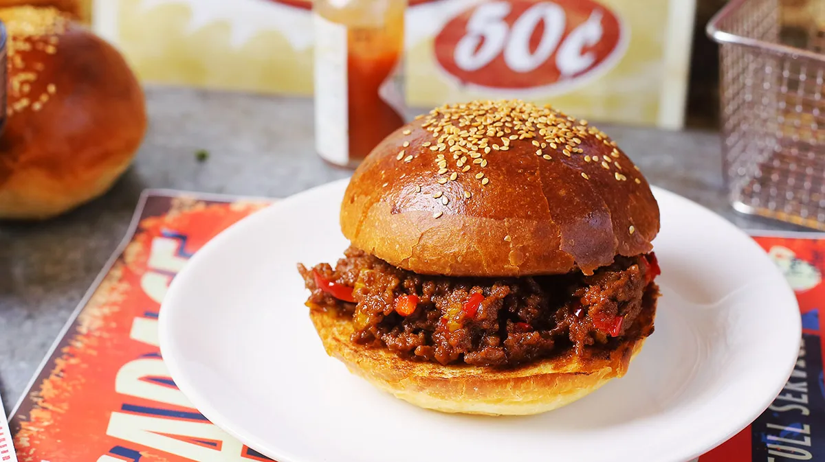 Vaj és olívaolaj keverékén üvegesre pirítjuk a vöröshagymát és fokhagymát, majd hozzáadjuk a darált marhahúst. Miután megpirult, nyomunk bele ketchup-ot és paradicsompürét. A pritaminpaprikát és az angol zellert apró kockákra vágjuk, és belekeverjük a raguba. Végül pedig jöhet az ízesítés: barnacukor, csípős szósz, Worcestershire szósz, mustár és a só.20 percig rotyogtatjuk, majd vajon lepirított buciba pakoljuk a ragut.