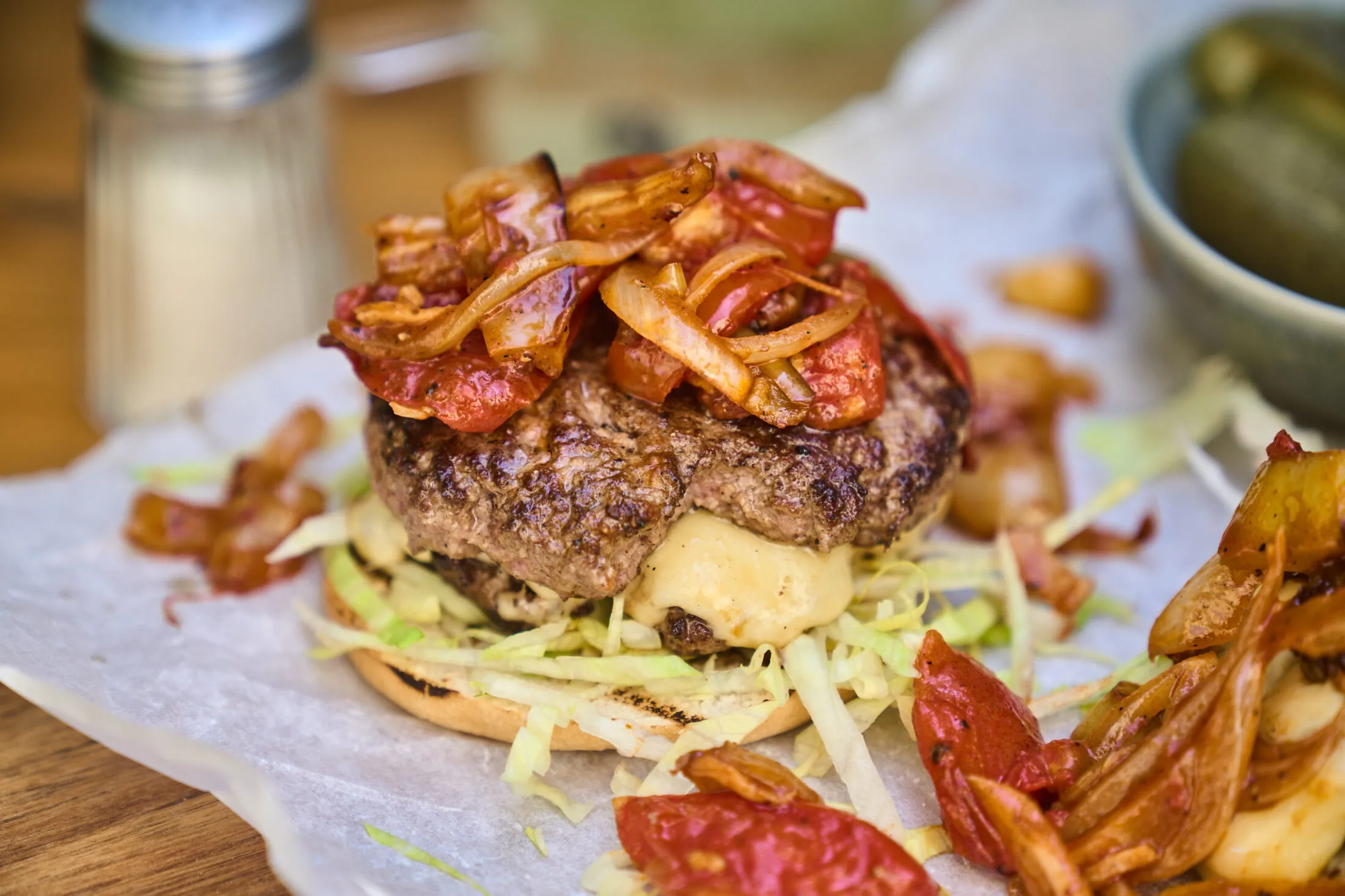 A smashed burger grillezett lecsóval elkészítését a lecsóval kezdjük. Ehhez a szalonnát vékony csíkokra vágjuk és a grill rostlapján, vagy ha ilyenünk nincs, egy nagyobb, grillre rakható serpenyőben elkezdjük pirítani. A paprikákat kicsumázzuk, rusztikusabb karikákra vágjuk, és a felszeletelt vöröshagyma és fokhagyma kíséretében a szalonnára dobjuk.