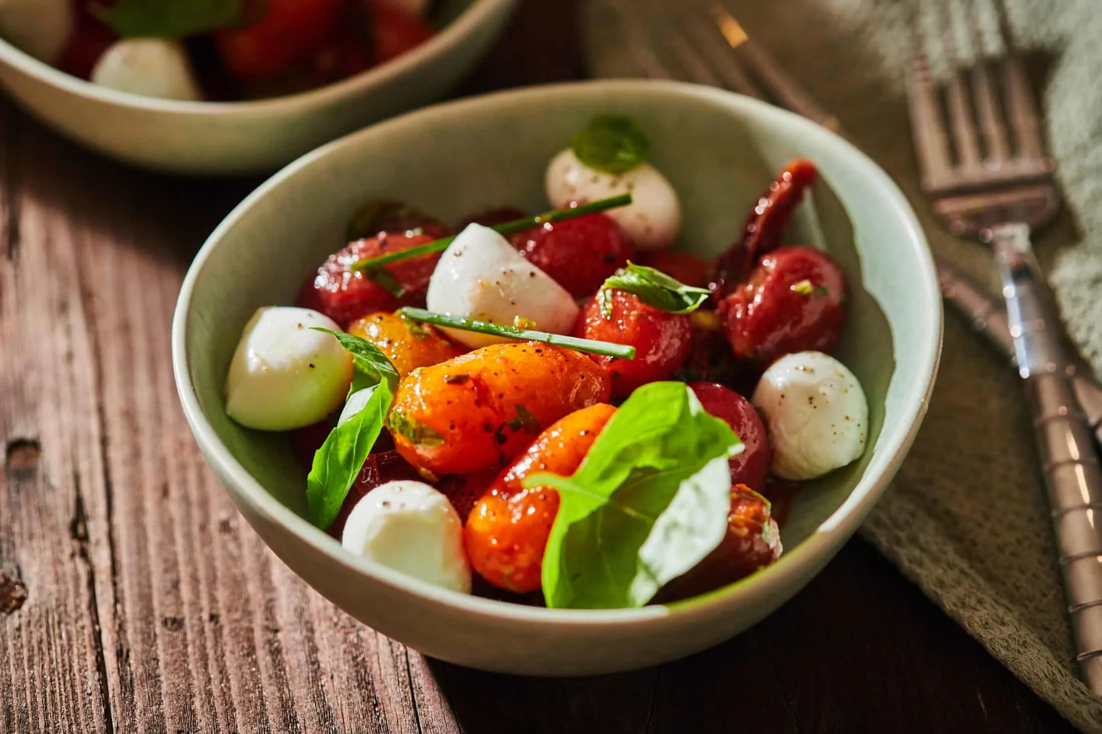 A szárított paradicsomot csíkokra, az újhagymát szeletekre vágjuk, a zöldfűszereket felaprítjuk (egy keveset félreteszünk a tálaláshoz), és egy tálba tesszük őket. Összekeverjük a hámozott paradicsommal, a dresszinggel, végül jöhet a mozzarellagolyó is. Ízlés szerint sózzuk, borsozzuk, tálalásnál a félrerakott friss snidlinggel és bazsalikommal díszíthetjük.