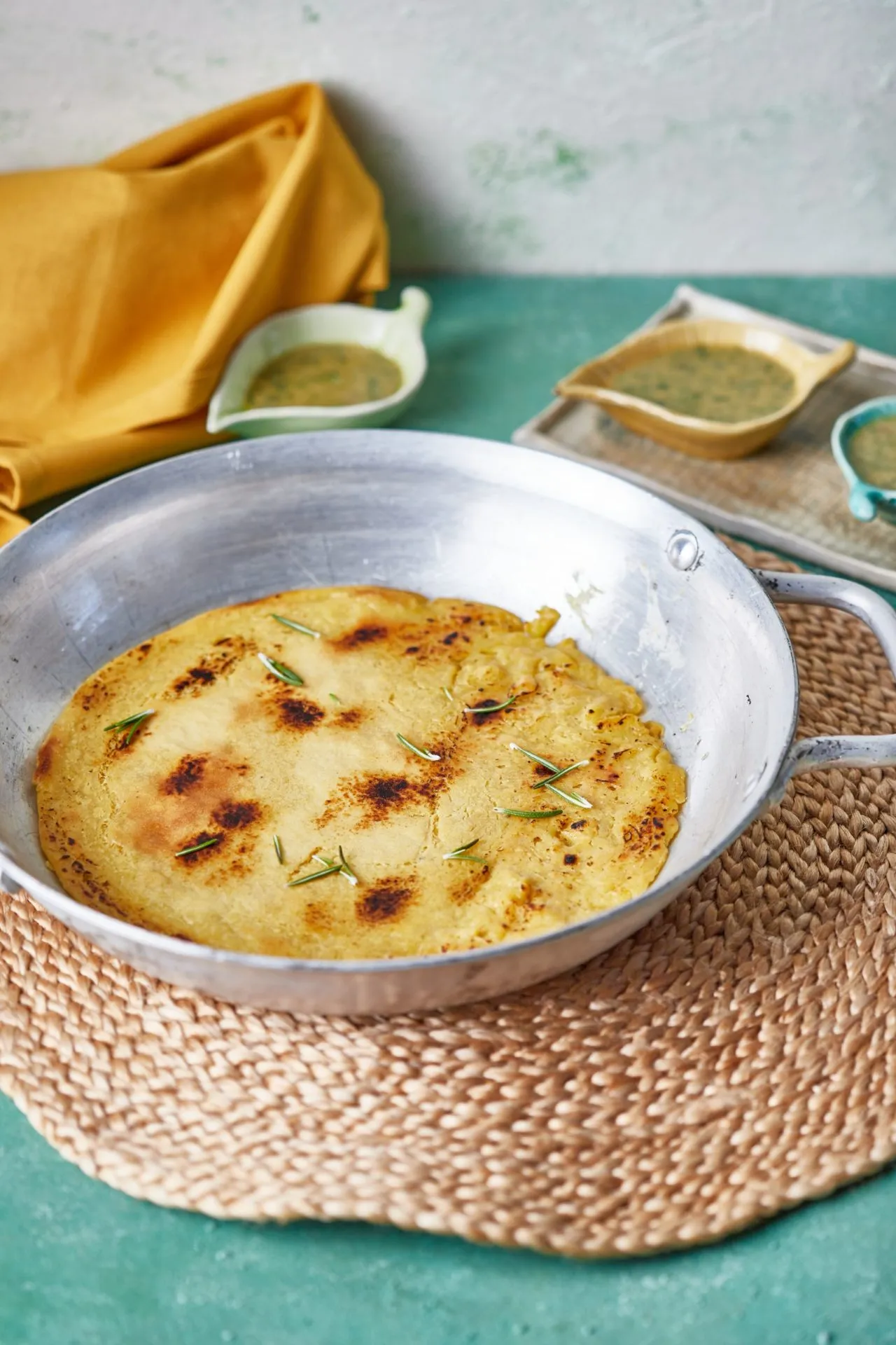 A csicseriborsóliszthez egy habverővel hozzákeverjük a vizet, 2 evőkanál olívaolajat, pár csipet sót és borsot, majd hagyjuk állni legalább 20 percet. A grillfokozaton 230 fokra előmelegített sütőbe helyezünk 2 közepes méretű hőálló serpenyőt. Kb. 10 perc múlva kivesszük a serpenyőket, beleöntünk 3-4 evőkanál olívaolajat mindkettőbe, majd kettéosztjuk csicseriborsómasszát, rátépkedjük a rozmaringot, és visszahelyezzük a sütőbe kb. 8-10 percre.