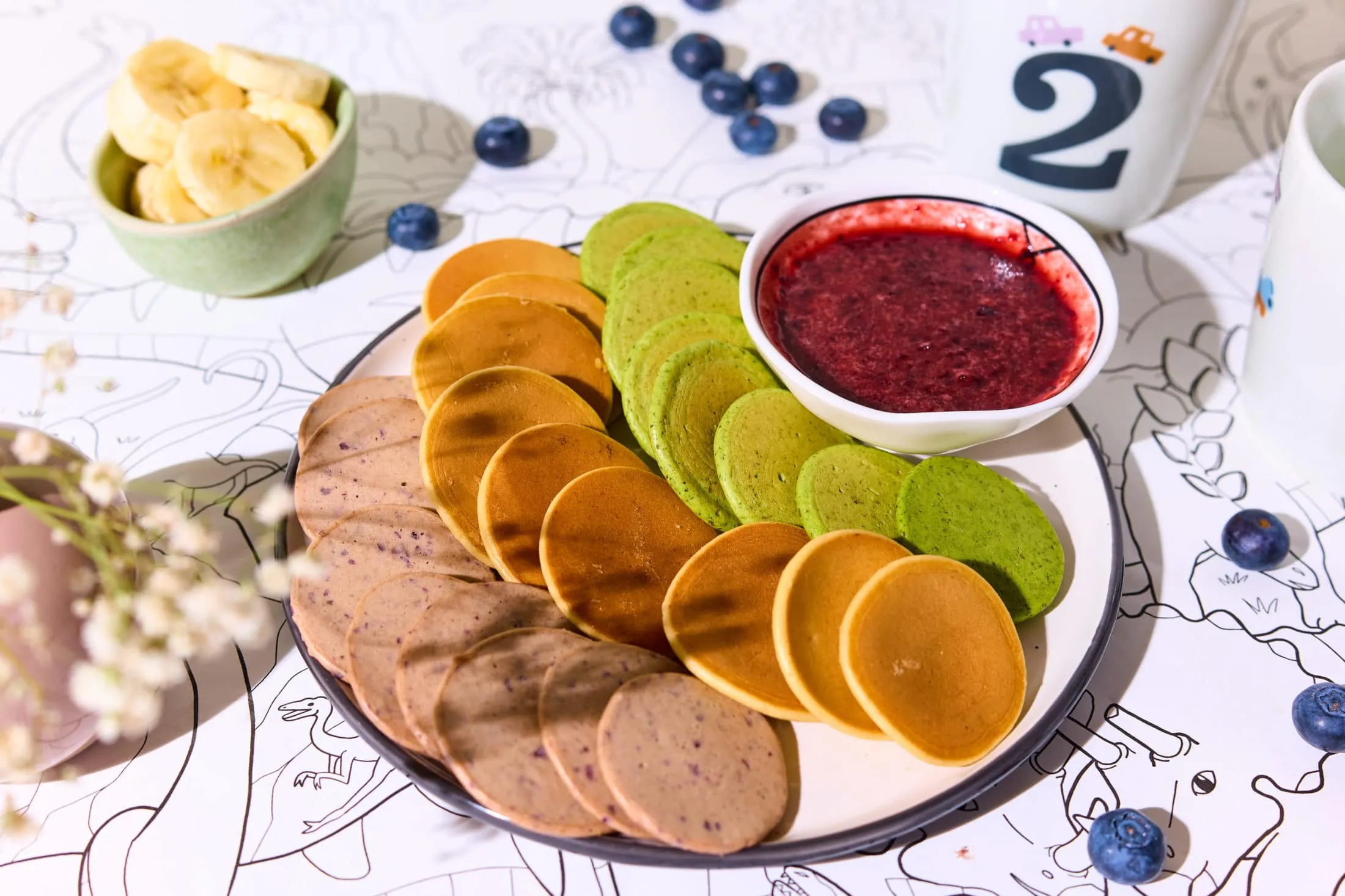 Külön-külön habzsákba töltjük a 3-féle tésztát. Egy tapadásmentes serpenyőt használunk, hogy ne kelljen hozzá olaj, ezt alacsony fokozaton felmelegítjük. A habzsák végét picit megvágva 5 cm-es korongokat nyomunk a serpenyőbe. Szép aranybarnára sütjük az egyik oldalát, majd megfordítjuk, és hasonlóképpen megsütjük a másik oldalát is. Ezt megismételjük mind a 3 tésztával, és készen is van a zöldséges, gyümölcsös, sokszínű babacsintánk, amit a babák könnyen el tudnak majszolni kézzel.