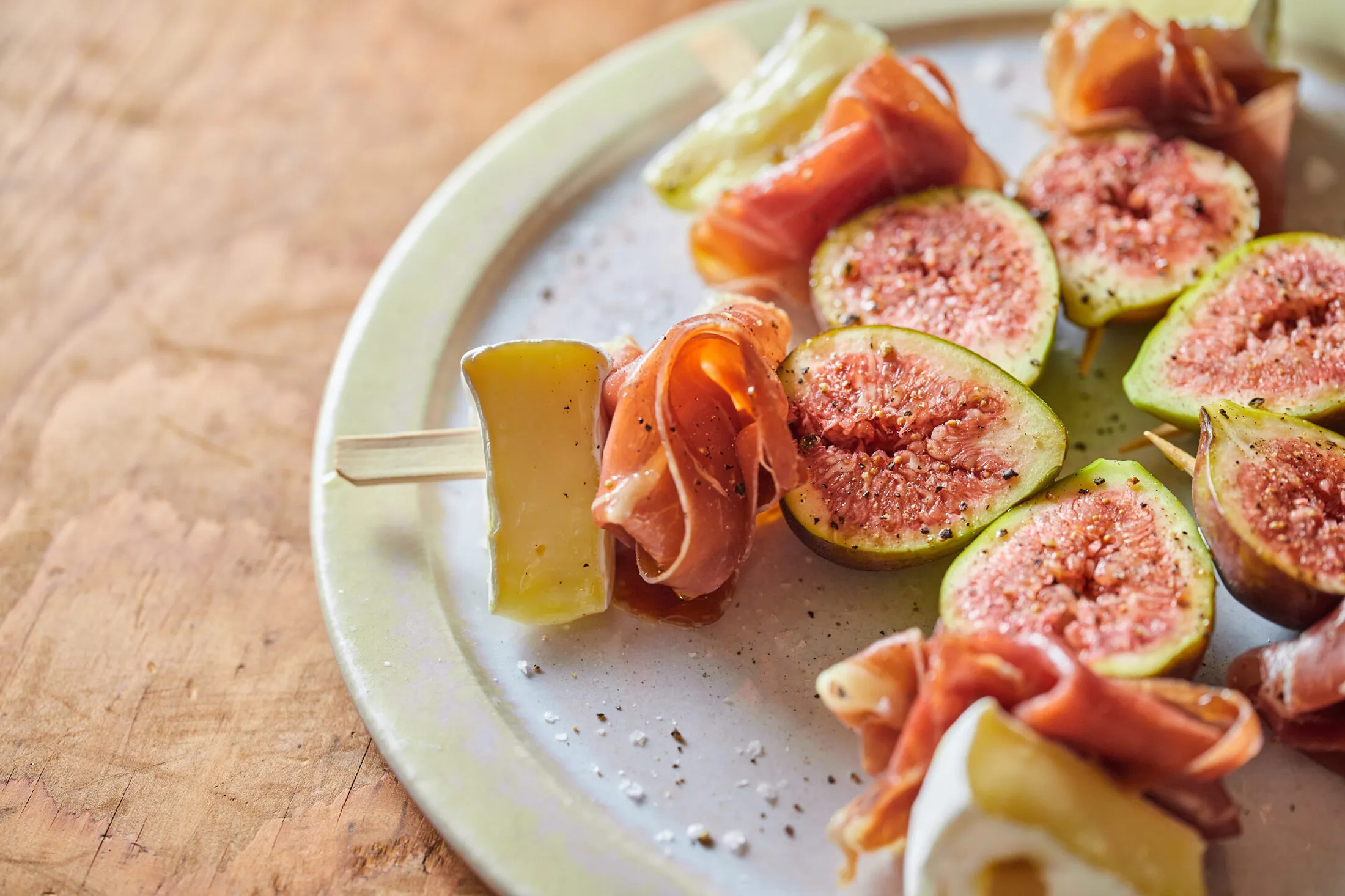 A sonkás-sajtos füge elkészítéséhez előbb a fügéket elfelezzük, a camembert-t cikkekre vágjuk, a sonkából pedig rózsákat hajtunk.
