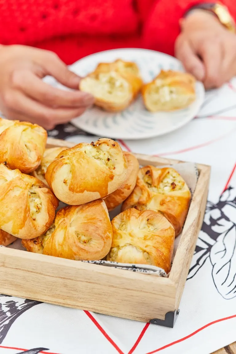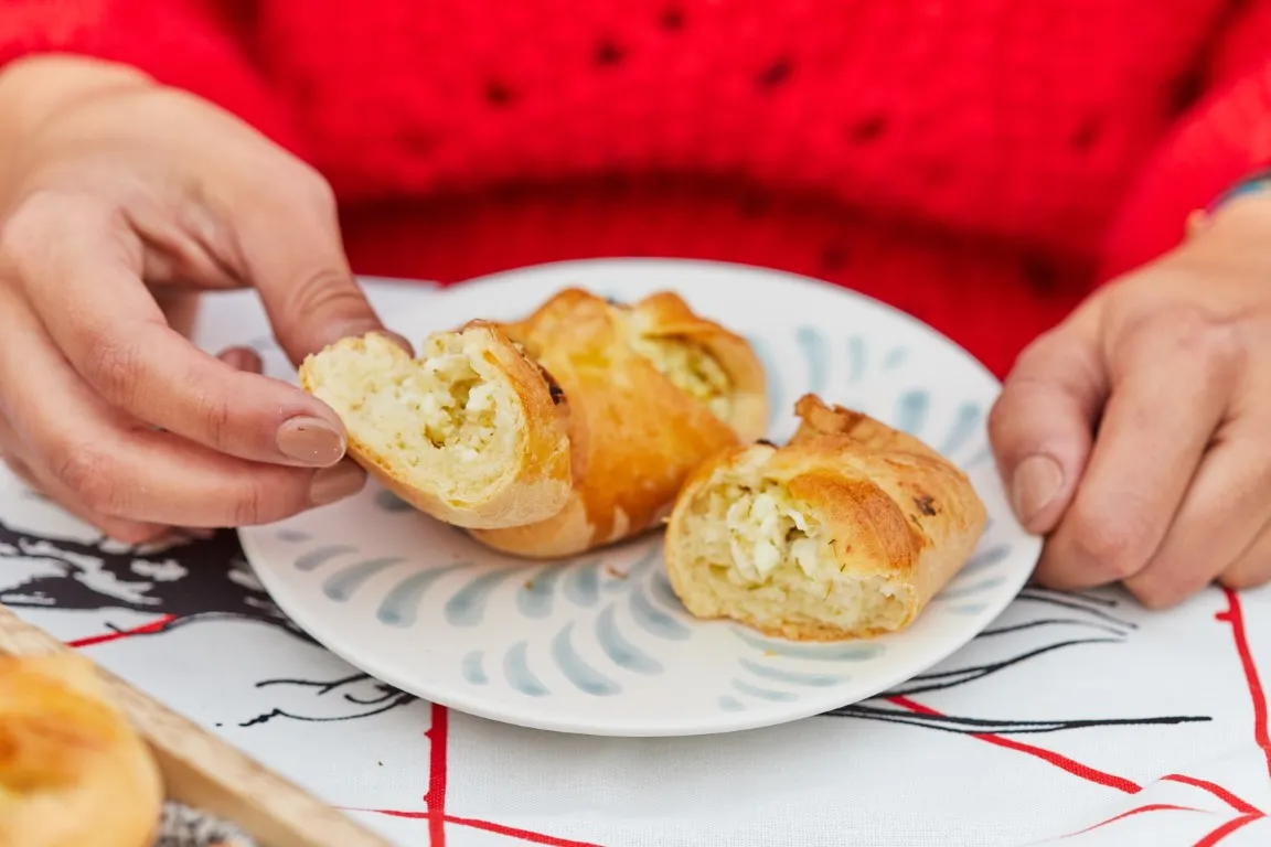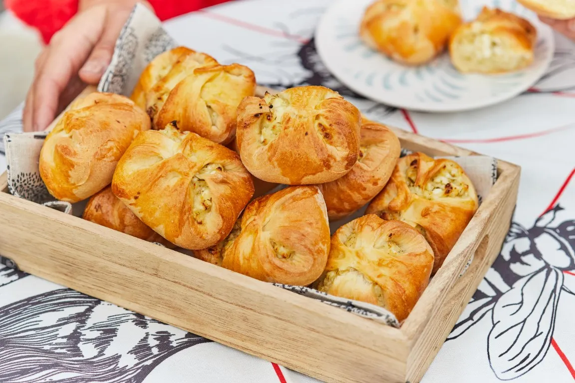 A töltelékhez a túrót villával kicsit áttörjük, majd hozzákeverjük az apróra vágott kaprot és a többi hozzávalót. A megkelt tésztát kissé átgyúrjuk, majd kinyújtjuk kb. 25x40-es méretűre. 7-8 cm-es négyzetekre vágjuk, mindegyik közepére 1-1 evőkanálnyi tölteléket rakunk, összecsípjük a sarkaikat, sütőpapíros tepsire rakjuk a batyukat és 15 percig kelesztjük. Lekenjük a tetejüket tojással és 180 fokra előmelegített sütőben kb. 25 perc alatt készre sütjük .