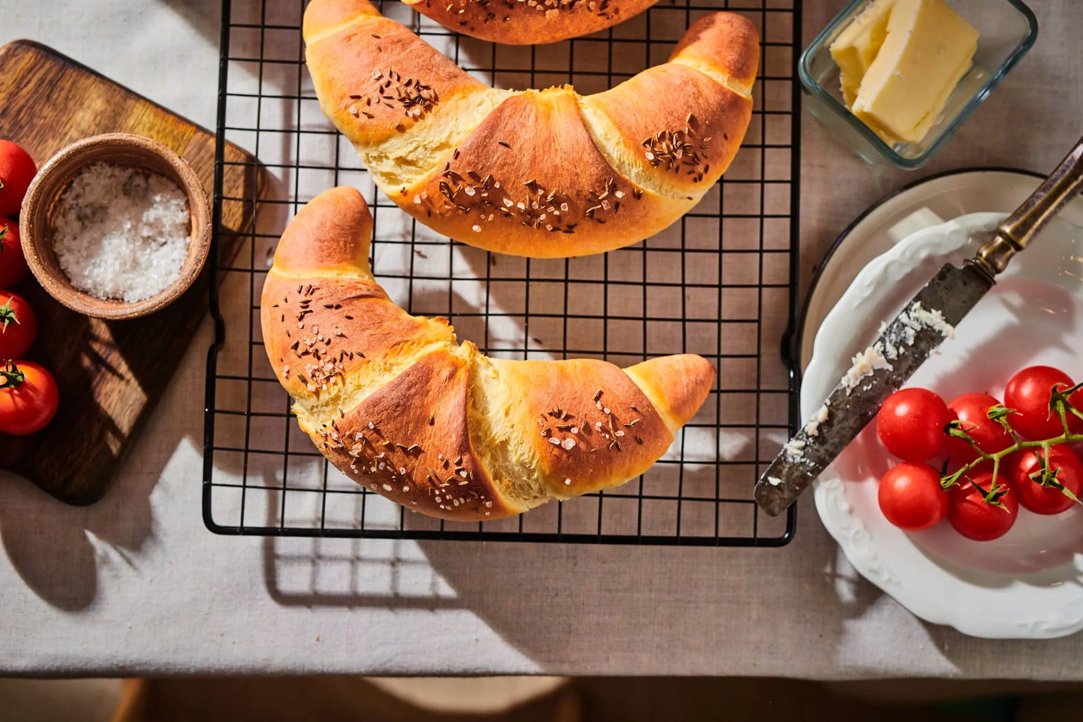 Ezután kissé átgyúrjuk, és 5 egyenlő részre osztjuk. Gombócokat formázunk belőle, letakarva 10 percig pihentetjük, majd egy kevés olajjal lekent felületen mindegyiket kb. 1,5 mm vékony, lekerekített háromszög formájúra nyújtjuk. A szélesebb oldalától a csúcsa felé haladva feltekerjük a háromszögeket és kifli alakúra hajlítjuk őket. Sütőpapíros tepsin további 30 percig kelesztjük, majd lekenjük kevés vízzel, megszórjuk sóval és köménymaggal, és mehet is 13-14 percre a 230 fokra előmelegített sütőbe, alsó-felső sütésre.