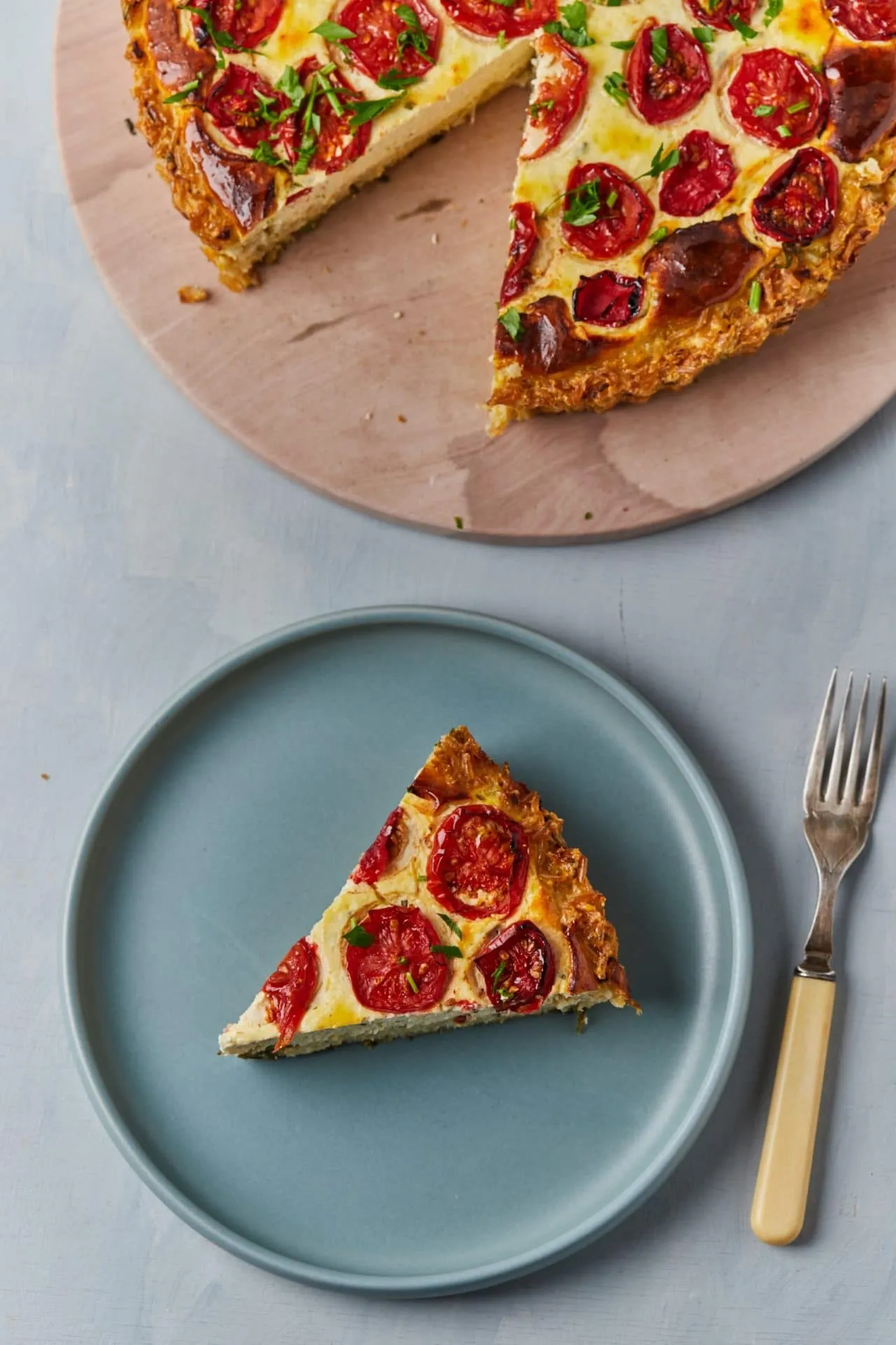 Közben egy aprítógépbe dobjuk a töltelék hozzávalóit, és krémesítjük. Rárakjuk a krémet az elősütött tésztára, rápakoljuk a bepácolt paradicsomot, és visszatoljuk a sütőbe 30 percre. Ha letelt az idő, felvesszük grillfokozatra, és egy picit rápirítunk a tetejére. Friss petrezselyemmel megszórva tálaljuk.