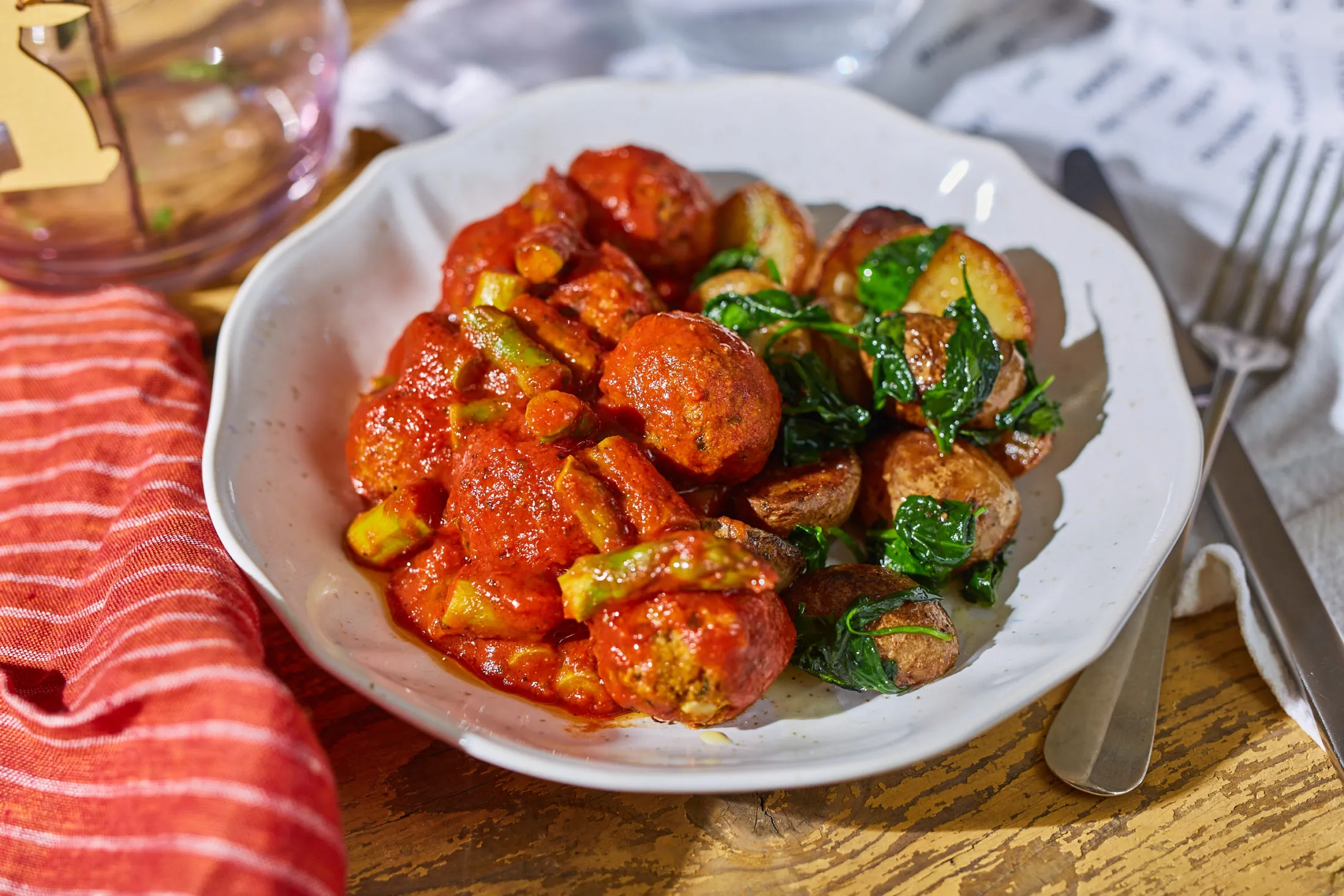 A passatát elkezdjük felmelegíteni egy serpenyőben, hozzáadjuk az olívaolajat, sózzuk, borsozzuk, oregánóval és bazsalikommal fűszerezzük. A zöld spárga alsó 2-3 cm-es fás részét levágjuk, a többit pedig 2 cm-es darabokra vágjuk, és a paradicsomszószba rakjuk. A spárgát 1-2 percig forraljuk a szószban, majd belerakjuk a megsült polpettéket, összeforgatjuk, és a spenótos újburgonyával tálaljuk.