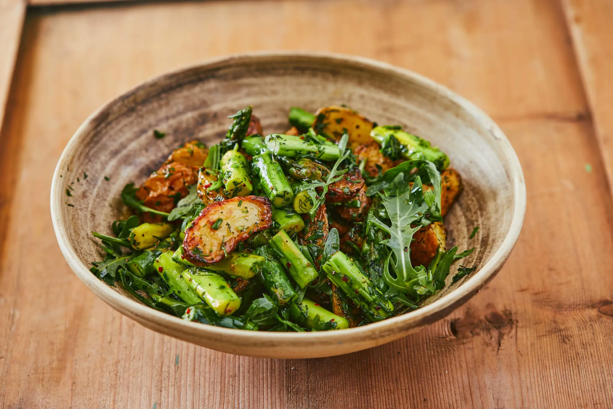 Közben a spárga szárát megtisztítjuk, a fás végeit levágjuk, majd kb. 3 cm-es darabokra vágjuk. Ha már letelt a 30-40 perc az újburgonya sütésénél (ami eddigre szépen meg kellett, hogy puhuljon), hozzászórjuk a tespire, átfogatjuk a burgonyával, és 10 percig együtt sütjük őket.