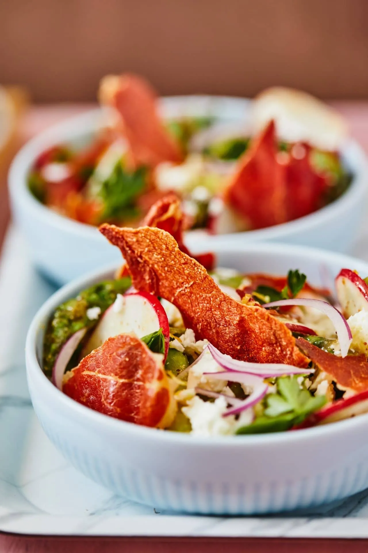A retket egy mandolinnal (szeletelő) vagy késsel 3 mm-es, a lila hagymát hajszálvékony szeletekre vágjuk. A serrano sonkát 2 papírtörlő között mikróban, a legmagasabb fokozaton 4-5 perc alatt ropogósra sütjük.