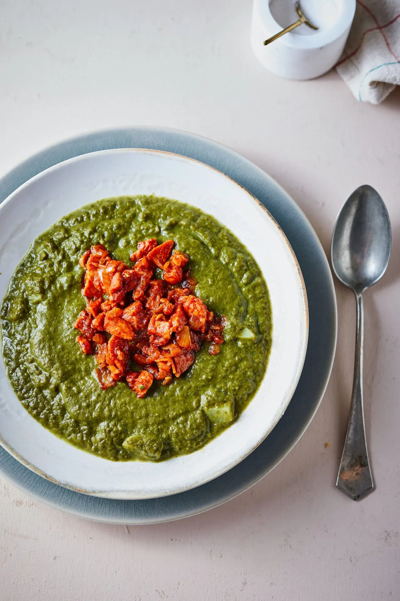 A feltéthez az olajon jól megpirítjuk a felkockázott sonkát. Kiszedjük, és a visszamaradt zsiradékon üvegesre pároljuk az apróra vágott hagymát és fokhagymát. Rárakjuk a sűrített paradicsomot, kicsit lepirítjuk, majd elkeverjük benne a füstölt paprikát, sózzuk, borsozzuk, felöntjük a vízzel, és addig rotyogtatjuk, amíg szépen be nem sűrűsödik. Ekkor visszarakjuk a sonkát, és kész is. A főzeléket ezzel a feltéttel tálaljuk.