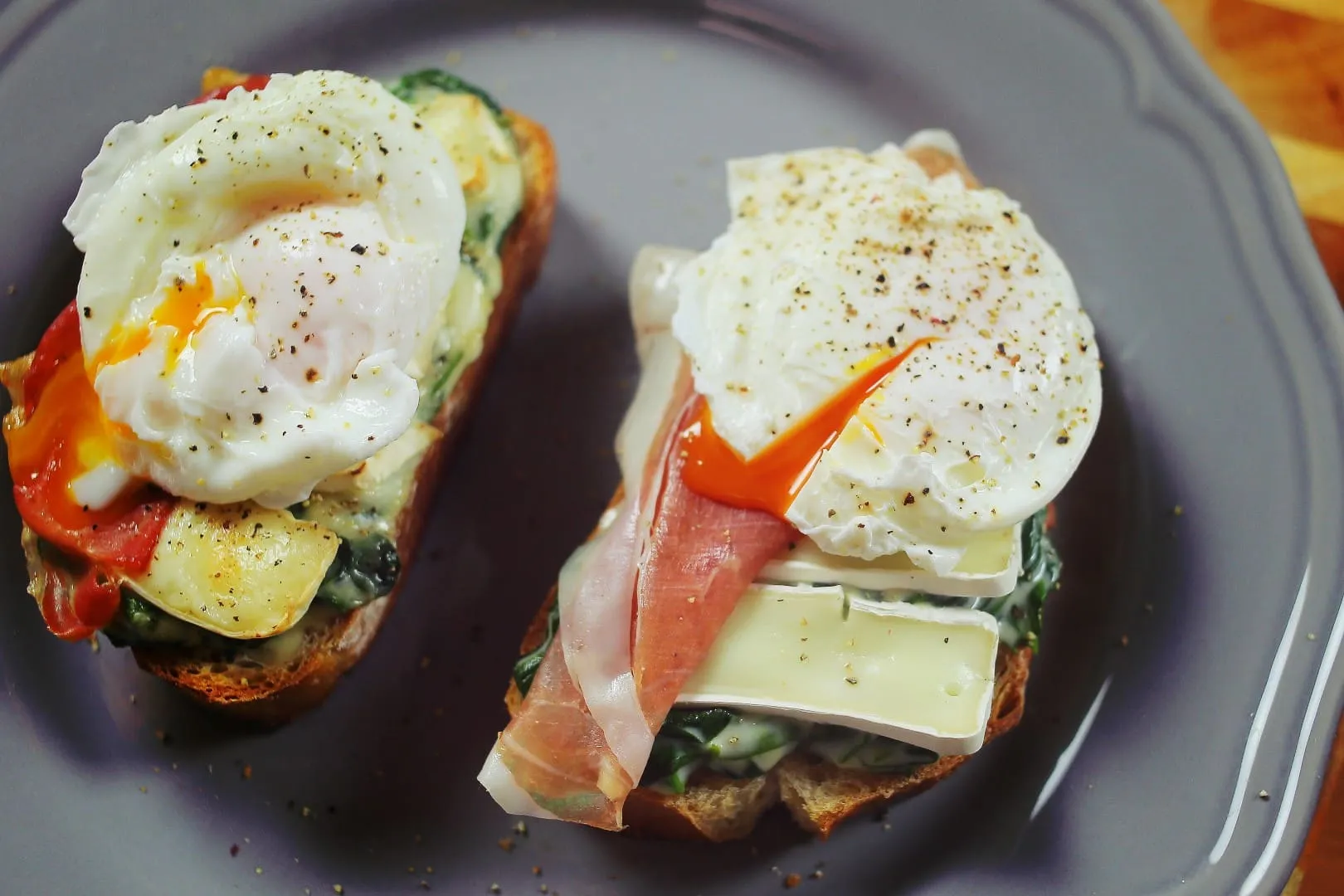 Egy lábasban vizet forralunk úgy, hogy éppen csak gyöngyözzön. Adunk hozzá egy kevés sót és egy kávéskanálnyi ecetet. A lábasban egy kanállal örvényt képzünk és egy tojást finoman pontosan az örvény közepébe csusszantunk. Három perc után óvatosan kiemeljük és megfőzzük a következő tojást is. Összeállítjuk a szendvicset: a kenyérszeleteket lepirítjuk, rápakoljuk a spenótos-camembertes krémet, ráhelyezzük a vékony szelet camembert sajtot és a sonkát és a sóval-borssal ízesített buggyantott tojást. Kész is a spenótos-camembert krémes szendvics!