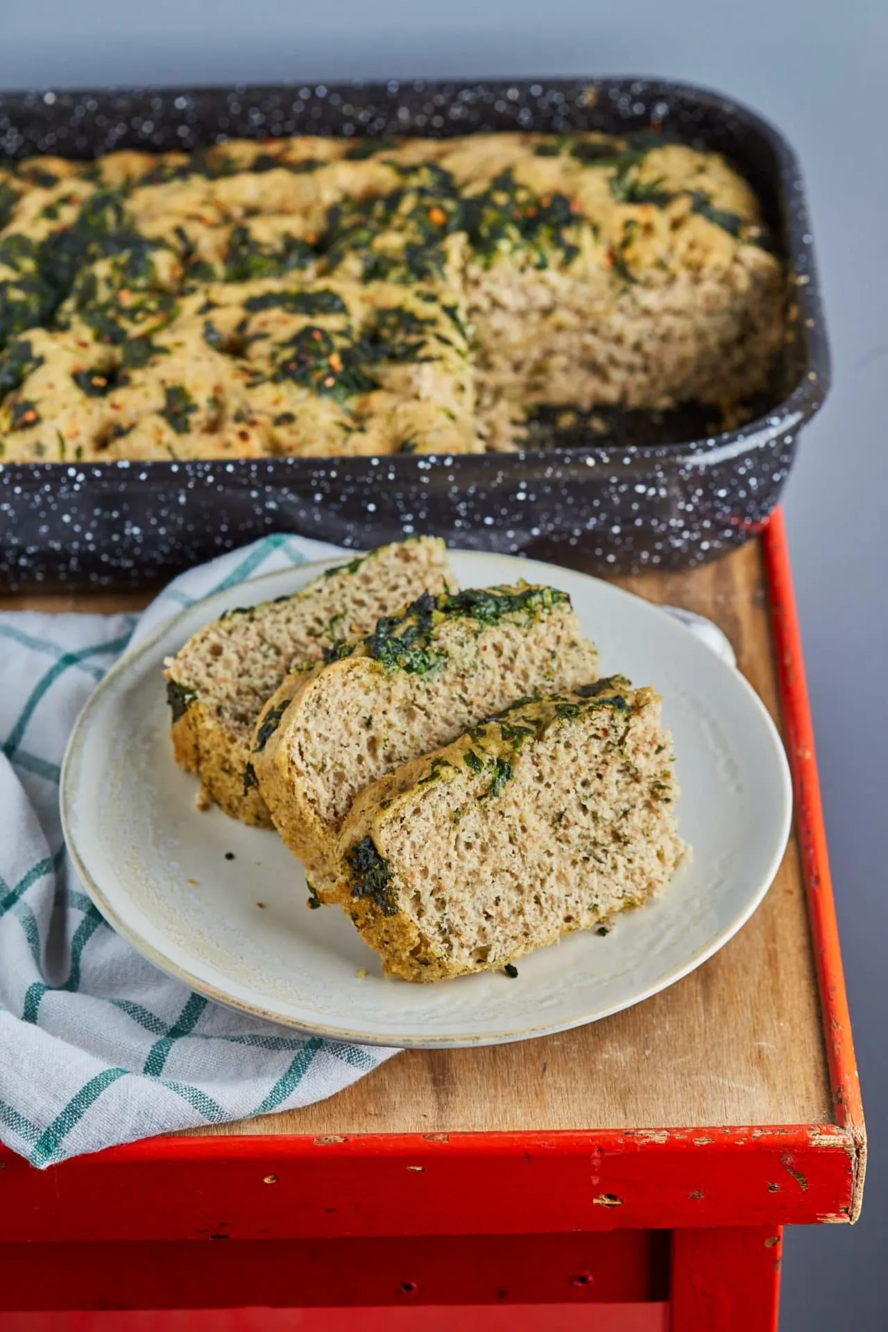 A tepsit kiolajozzuk, és belerakjuk a tésztát. Az ujjbegyünkkel enyhén megnyomkodjuk a tetejét. Lefedjük, és hagyjuk újabb fél órát kelni. Ha letelt az idő, rárakjuk a maradék spenótot, megszórjuk a chilivel, meglocsoljuk egy kevés olajjal, és 180 fokra előmelegített sütőben 20 percig, majd 200 fokra emelve a hőt, 10 percig sütjük.