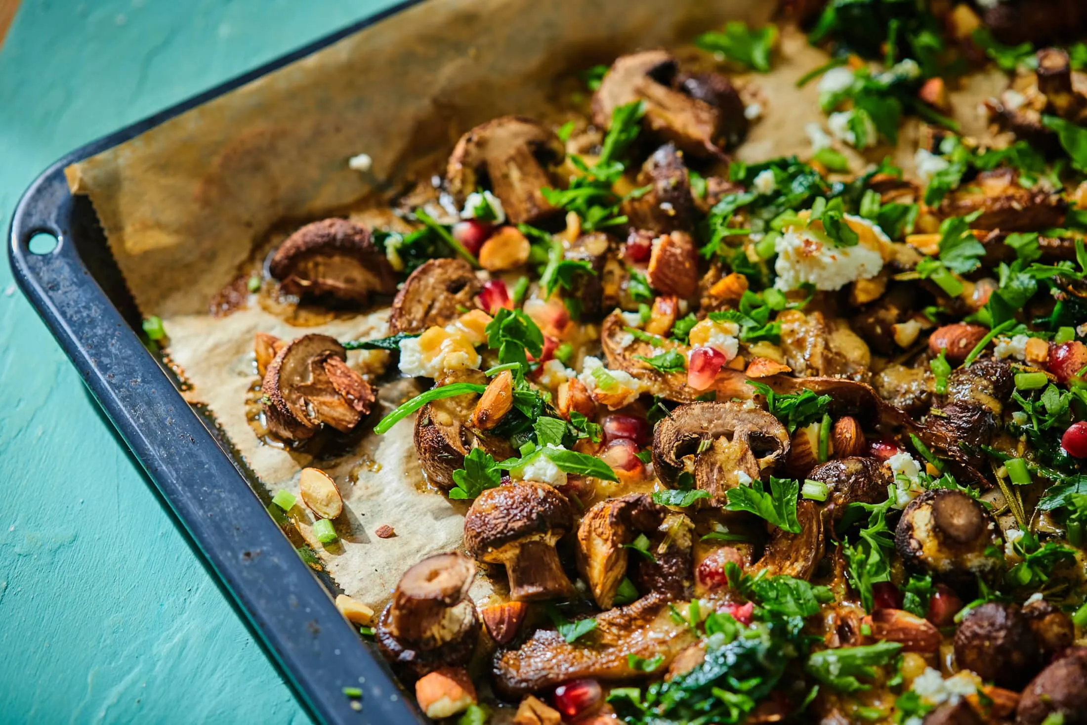 Egy serpenyőben, a maradék olajon megfuttatjuk a zúzott fokhagymát, sózzuk, borsozzuk, és rádobjuk a megmosott spenótot. Ha nagyjából összeesett, elzárjuk alatta a gázt és rárakjuk a tepsire. Megszórjuk a gombás keveréket aprított mandulával, gránátalmával, apróra vágott petrezselyemmel és fetával.