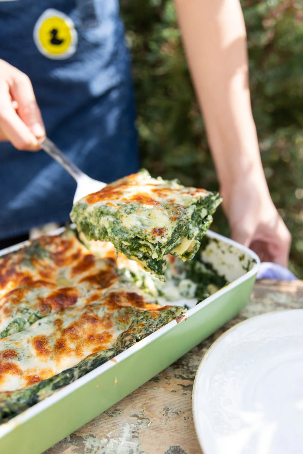 Kb. akkora tepsit használunk, ami 3 lasagnelap nagyságú. Alulra teszünk egy réteg besamelt, jöhet egy réteg tésztalap, egy réteg spenót, erre egy adag besamel, rácsipkedünk a mozzarellából és szórunk rá a reszelt parmezánból, majd újra jöhet a tészta. Ezt a műveletet még kétszer megismételjük, az utolsó tésztarétegre még csurgatunk egy kis spenótmártást és besamelt, és megszórjuk a sajttal. 200 fokos sütőben 35 perc alatt megsütjük. Ha megsült, kicsit hagyjuk állni, és csak azután vágjuk fel.