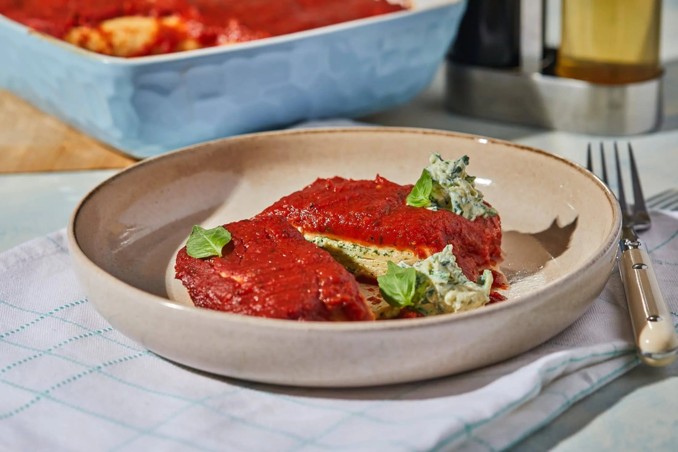 A palacsintákat megkenjük a ricottával, és batyuvá hajtogatjuk: először a tészta tetejét behajtjuk a palacsinta közepéig, majd az alját és végül a két szélét is behajtjuk. Hőálló tálba tesszük, meglocsoljuk a paradicsomos mártással, és 160 fokra előmelegített sütőben 10-15 perc alatt összesütjük.