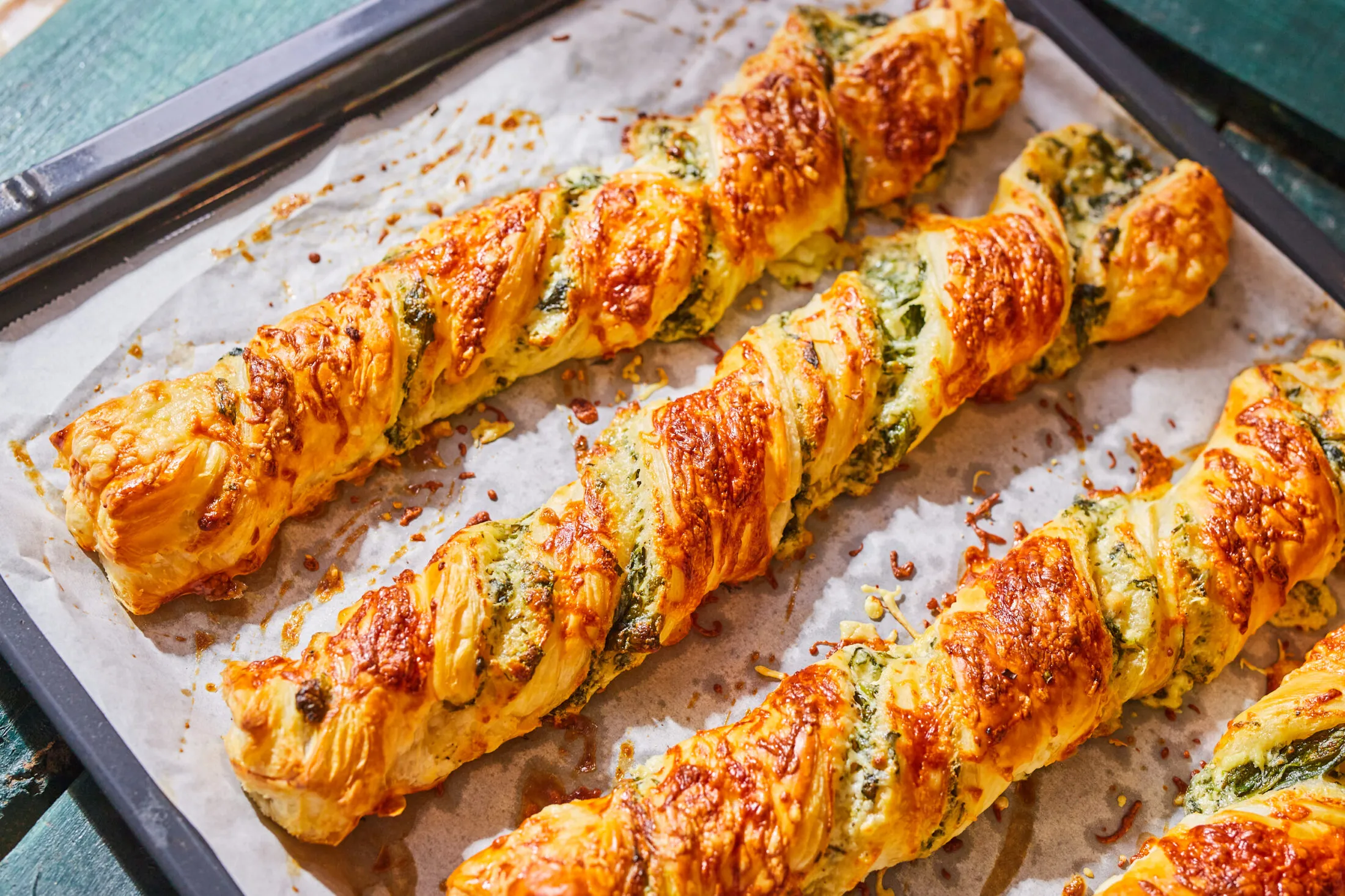 Az egyik tésztalapot kiterítjük, megkenjük a krémsajtos-spenótos keverékkel, majd erre ráhelyezzük a másik leveles tésztát. Kissé lenyomkodjuk, 8 egyenlő vastagságú csíkot vágunk belőle, és mindegyiket megcsavarjuk, hogy szép spirál alakot adjanak ki. Két 45 x 38 cm-es tepsit kibélelünk sütőpapírral, és ezekre helyezünk 4-4 db csavartat, lekenjük őket tojással és megszórjuk a maradék reszelt sajtokkal.