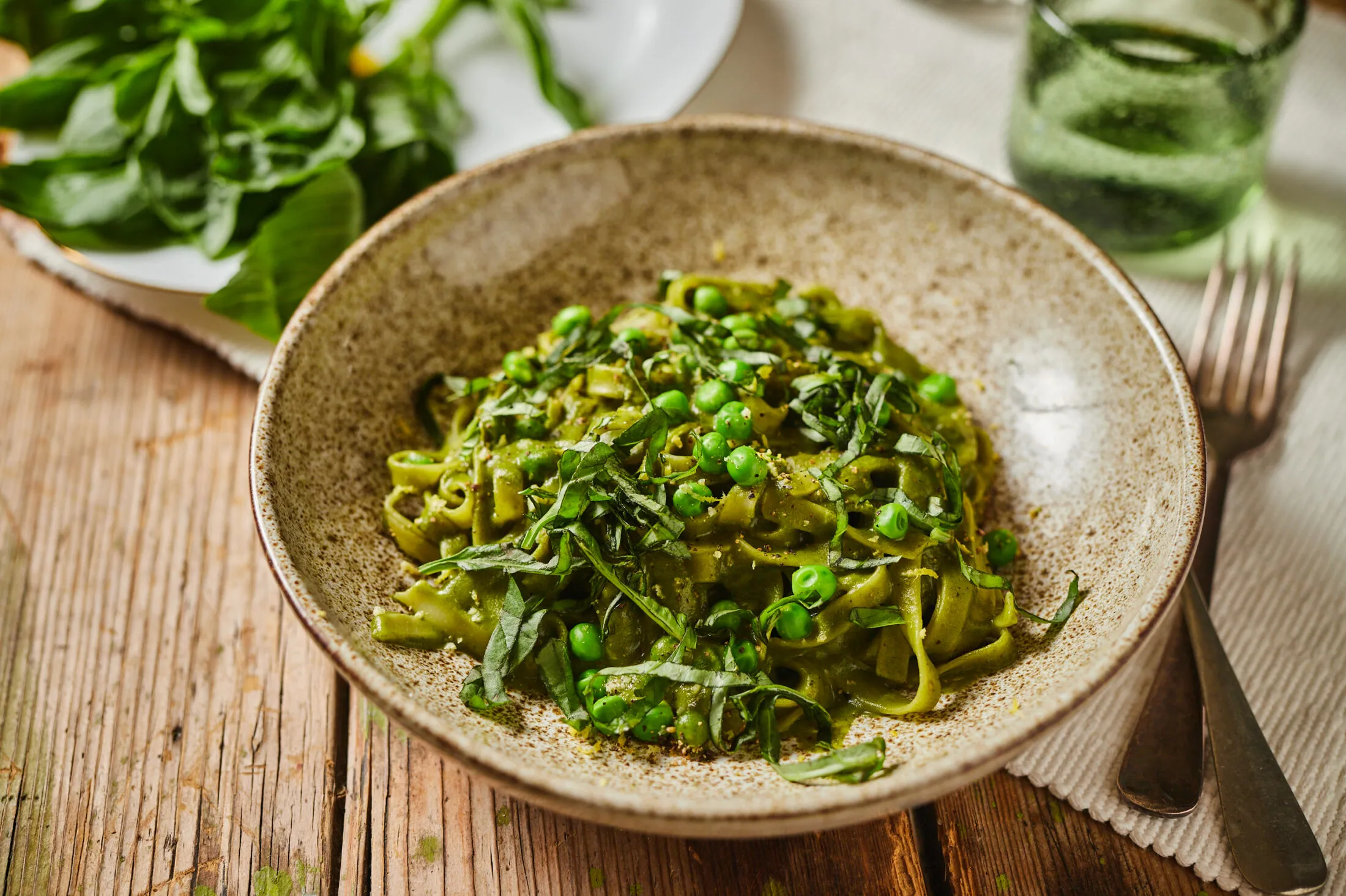 A megfőtt tésztát a serpenyőbe rakjuk, felöntjük a krémesre turmixolt zöld szósszal és hozzáadjuk a maradék zöldborsót. Frissen reszelt citromhéjjal, borssal és a maradék aprított bazsalikommal megszórva tálaljuk.